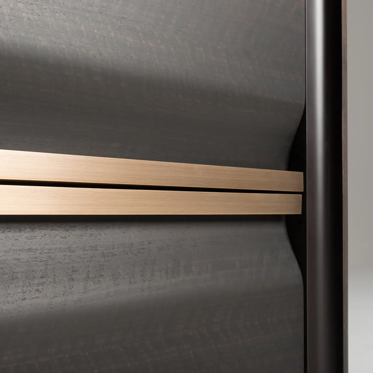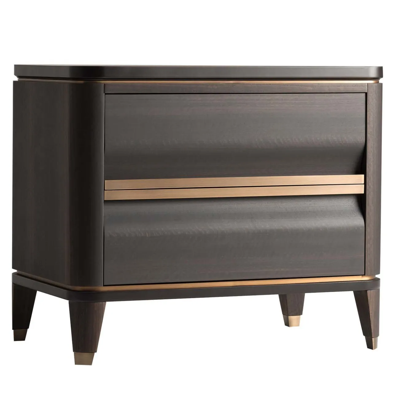 Comodino dalla linea compatta ed essenziale, impreziosito dalla foglia di eucalipto frisee trattata a caldo, sapientemente assemblata e trattata per esaltare la tridimensionalità delle venature. La linea rigorosa è sottolineata dalle maniglie e dai piedini in ottone brunito. L’interno di ogni cassetto è rivestito in vera pelle per conservare con cura gli oggetti.
