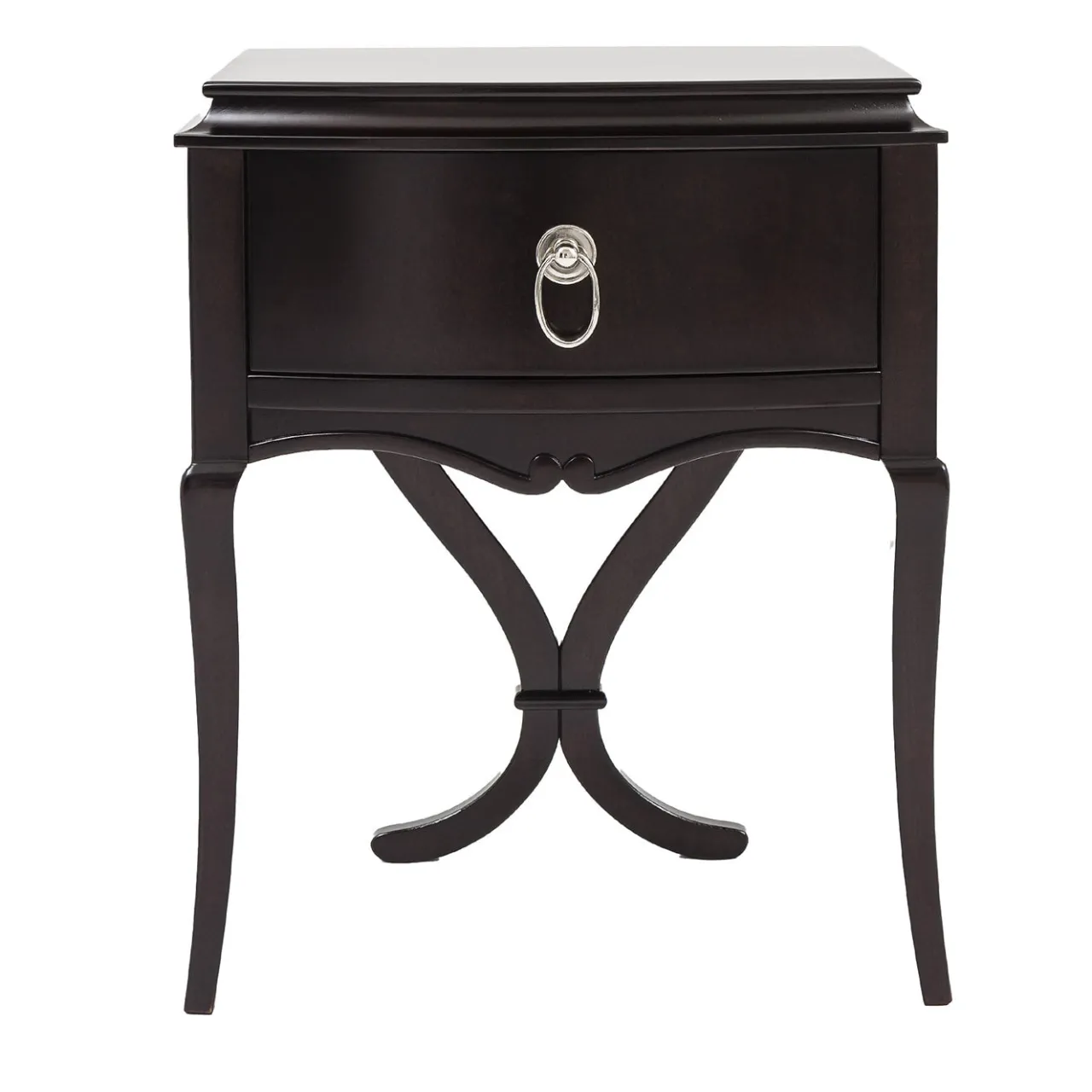 Comodino ispirato al design Art Decò, dotato di un singolo cassetto con scivoli ammortizzati a chiusura autonoma. Realizzato interamente in pannelli di legno di ciliegio con una finitura eba, è impreziosito da una maniglia in metallo cromato lucido. Il pezzo poggia su quattro gambe elegantemente curve collegate da un traverso sagomato, combinando funzionalità con un’estetica raffinata. Adatto per aggiungere un tocco di sofisticazione classica a qualsiasi ambiente camerale.