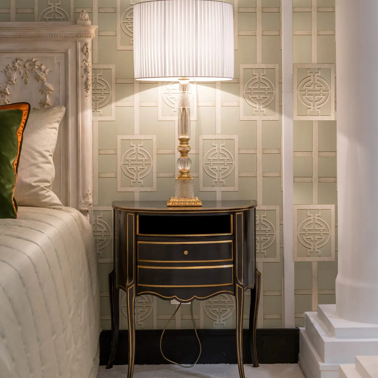Meravigliosa vetrina di artigianato in stile French Transition, questo comodino sarà un complemento perfetto per una camera da letto classica e lussuosa. Realizzato a mano in legno di faggio laccato in nero con dettagli e profilo dorati, presenta linee eleganti e sinuose dall’allure semplice e sofisticata.