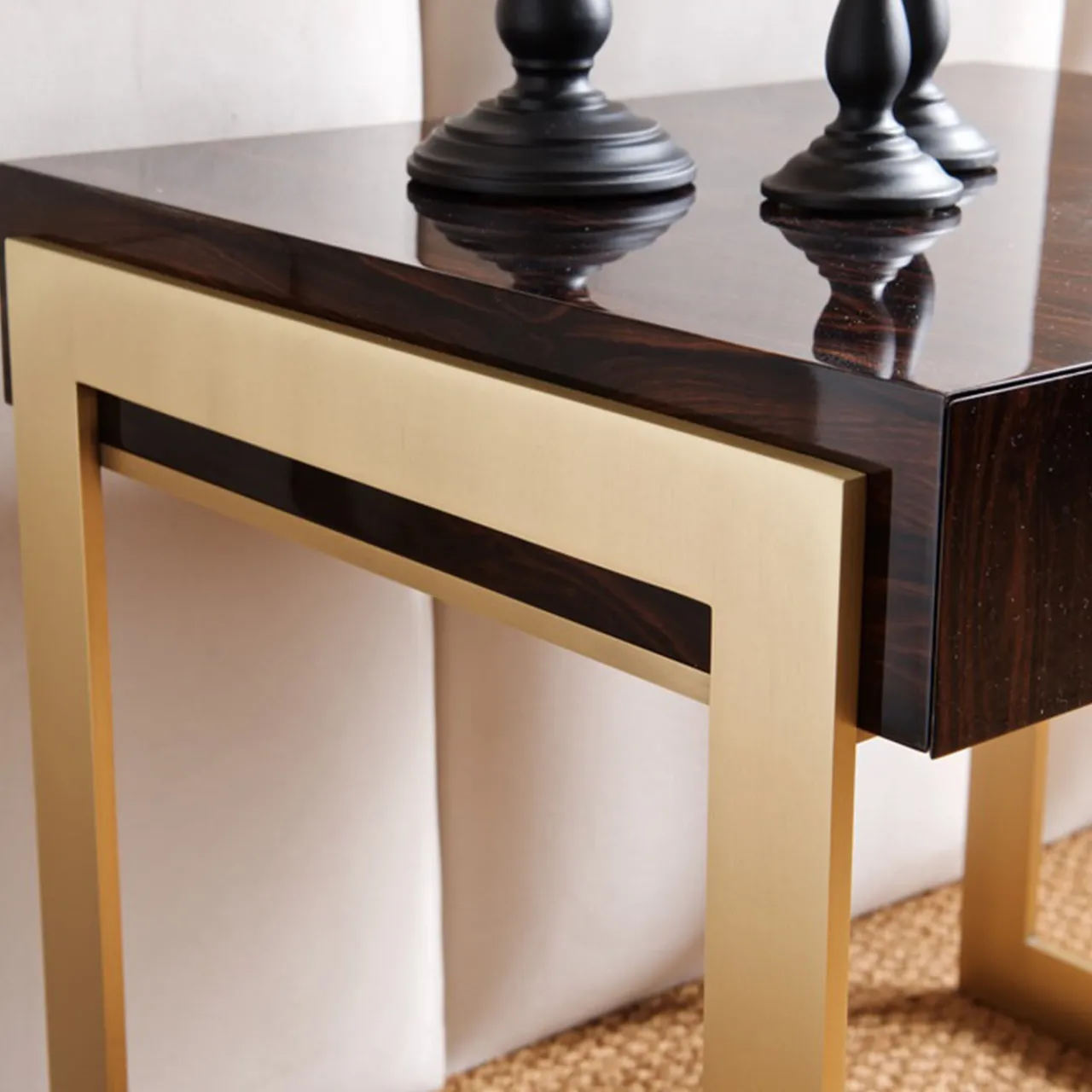 Questo lussuoso comodino presenta un’audace combinazione di colori, texture e motivi contrastanti all’interno di una struttura lineare e minimalista, rivelando un design intrigante che infonderà raffinatezza in una camera da letto moderna. La struttura è alta e leggera, composta da due sottili sagome rettangolari in metallo bronzato. Sostengono un piano con cassetto in pregiato ebano Macassar per un accento prezioso. Audace e raffinato, è il complemento perfetto sia per una casa elegante che per un hotel di lusso.