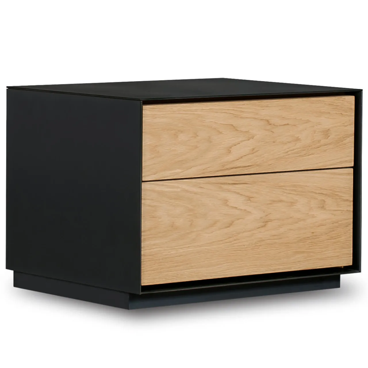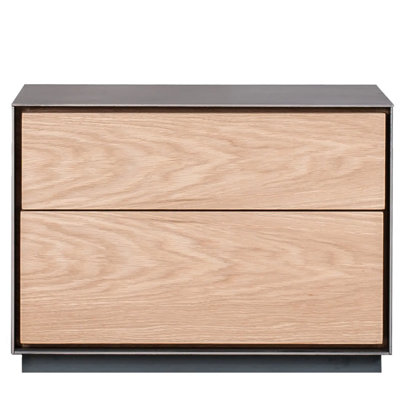 Classe minimalista e disadorna caratterizzano questo raffinato comodino, dal design moderno concepito per privilegiare l’attenzione ai suoi componenti naturali. La coppia di cassetti di cui è dotato sfoggia frontali in legno di rovere, le cui imprevedibili venature prive di nodi sono l’unico tratto decorativo dell’intero progetto. L’influenza urbana è rivelata dalla scocca e dalla base a zoccolo in ferro laccato grigio antracite.