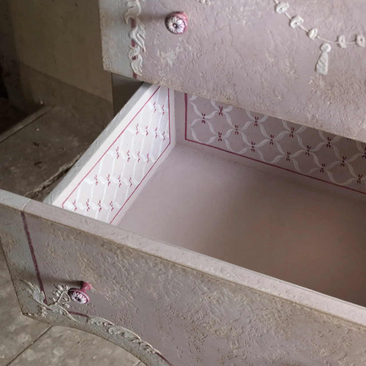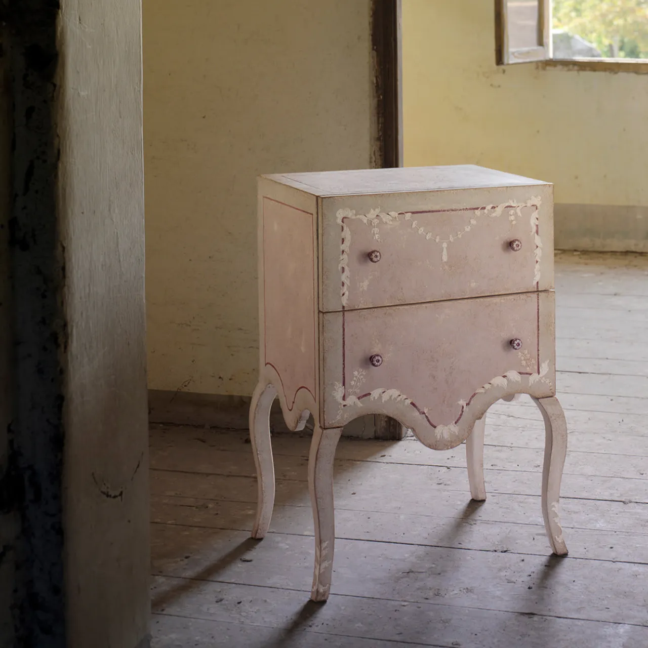 Questo comodino su misura in legno dipinto di rosa pastello è un gioiello di lavorazione del legno e di tecniche di pittura a mano in stile veneziano. Caratterizzato da linee aggraziate, il mobile contenitore sollevato su gambe cabriole si distingue per i profili ondulati del fondo e per le sottili linee fucsia con motivi di fronde bianche arrotolate intorno ad esse. È inoltre possibile richiedere uno strato protettivo aggiuntivo per la superficie superiore. Ampiamente personalizzabile per soddisfare i gusti e le esigenze di arredamento di qualsiasi cliente, si prega di contattare il Concierge per le richieste di personalizzazione.