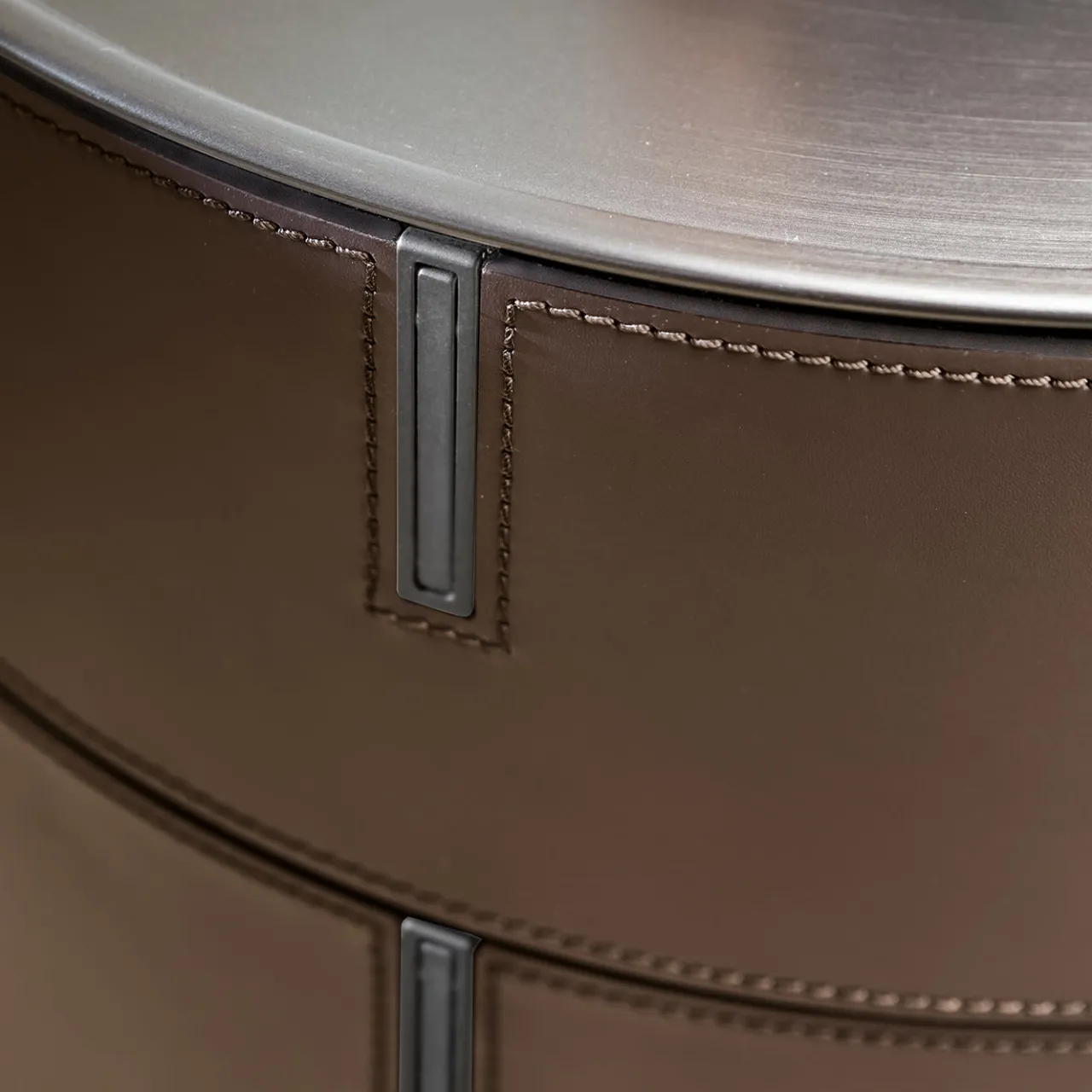 Questo comodino presenta una struttura in MDF piegata a vapore, rivestita in pelle con cuciture decorative. Ognuno dei tre cassetti scorre senza fatica su guide metalliche, con frontali rivestiti in pelle e impreziositi da cuciture decorative. Completano il suo fascino le eleganti maniglie in metallo e la scelta di vassoi in acciaio nelle finiture peltrox, bronzo, titanio o champagne. Disegnato da Giuseppe Bavuso, questo pezzo aggiunge un tocco di giocosa eleganza a qualsiasi camera da letto.