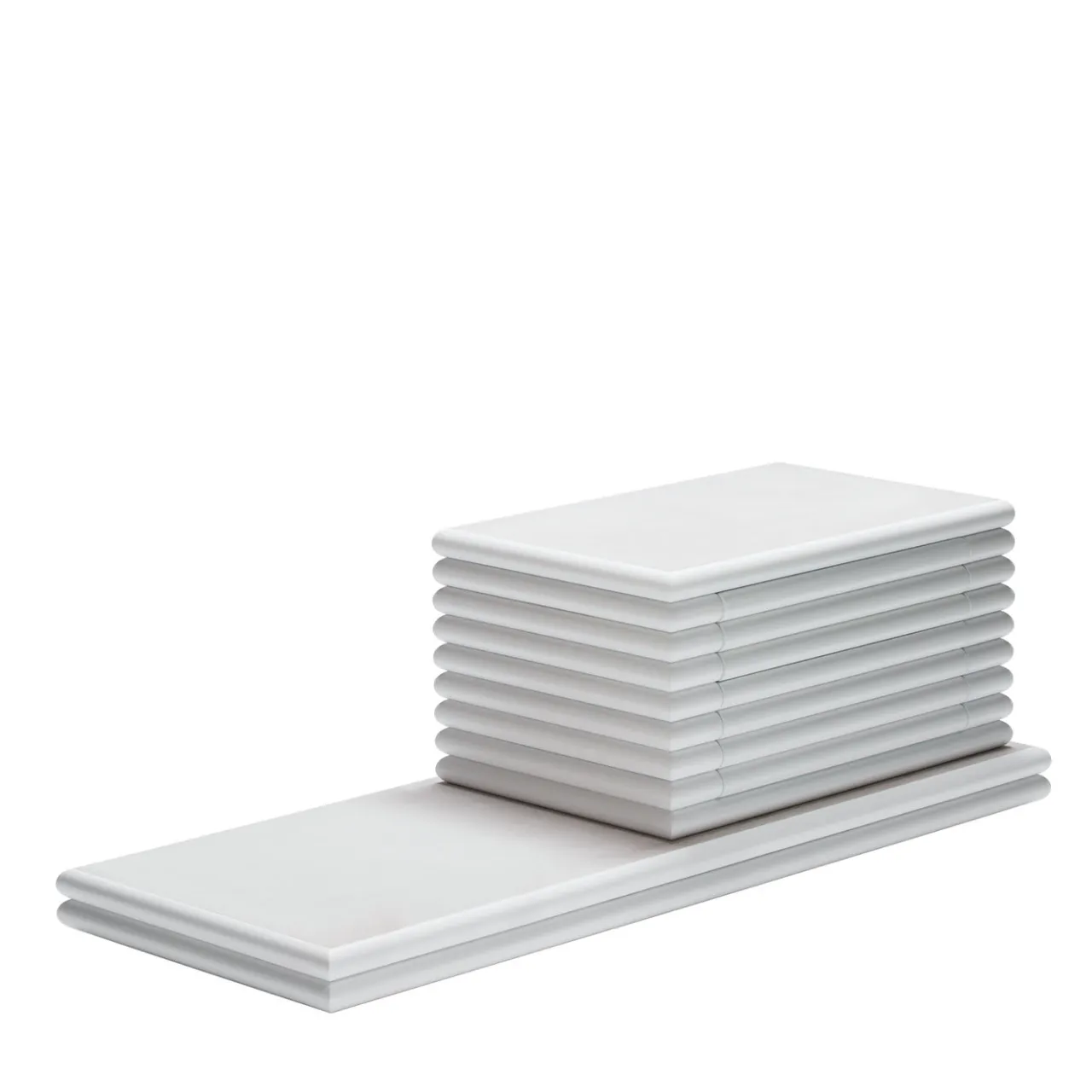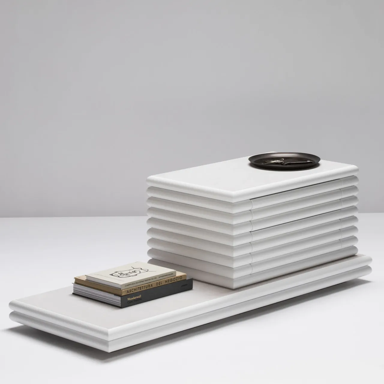 Una silhouette originale con un design dinamico e contemporaneo definisce questo accattivante comodino disegnato da Stéphane Parmentier per Giobagnara. Rivestito in morbida pelle bianca, il motivo ricorrente della collezione Scala, costituito da strati tubolari uniformi, si ritrova sia sul mobile a 2 cassetti che sulla piattaforma rettangolare allungata su cui poggia.