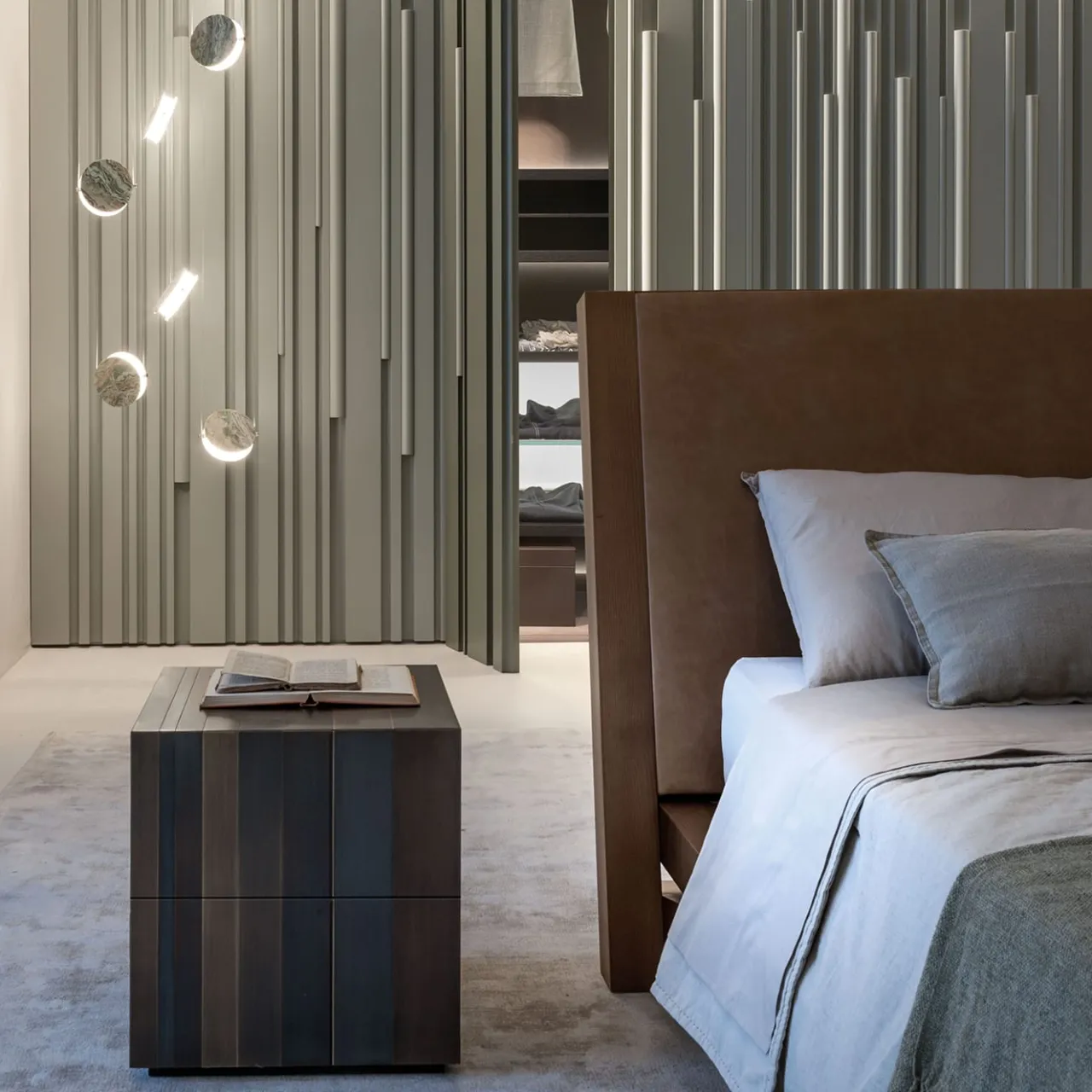 Questo comodino combina materiali audaci con un’eleganza funzionale. La parte anteriore e i pannelli laterali presentano una sorprendente finitura in rame brunito, mentre il piano e l’interno in noce aggiungono calore e consistenza. La base laccata nera opaca costituisce una base elegante. La personalizzazione è disponibile in acciaio lucido, ottone satinato e ferro nero, per offrire una varietà di scelte estetiche. Per maggiori dettagli, contattare il Concierge.