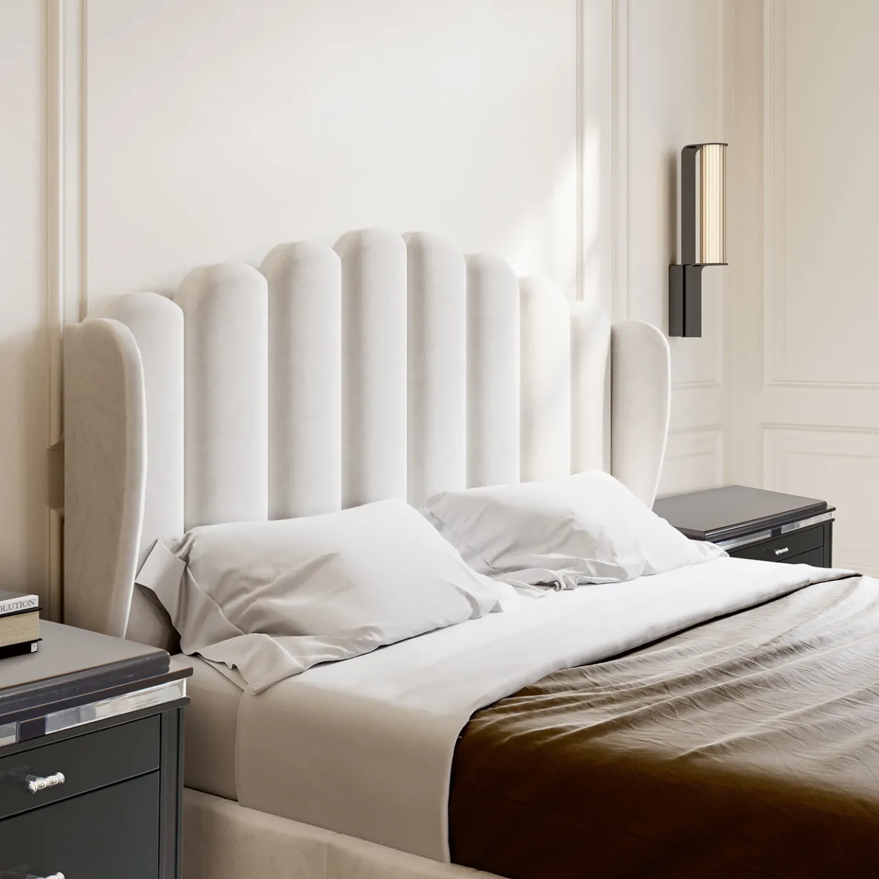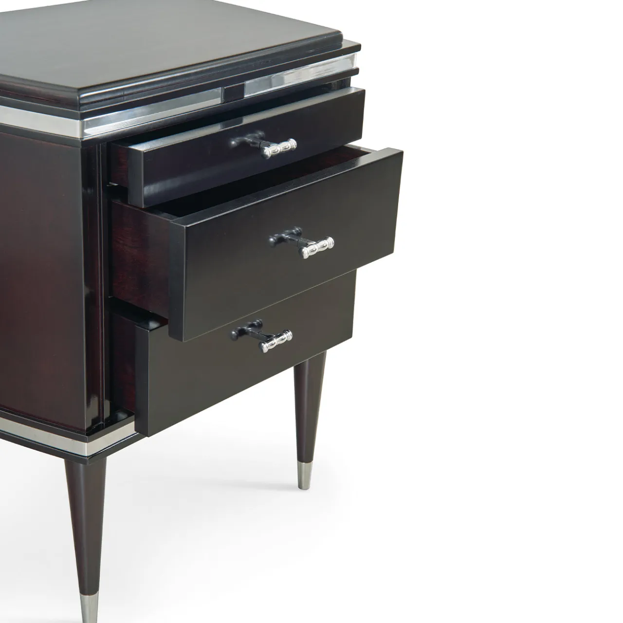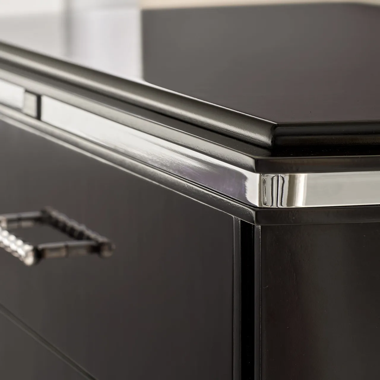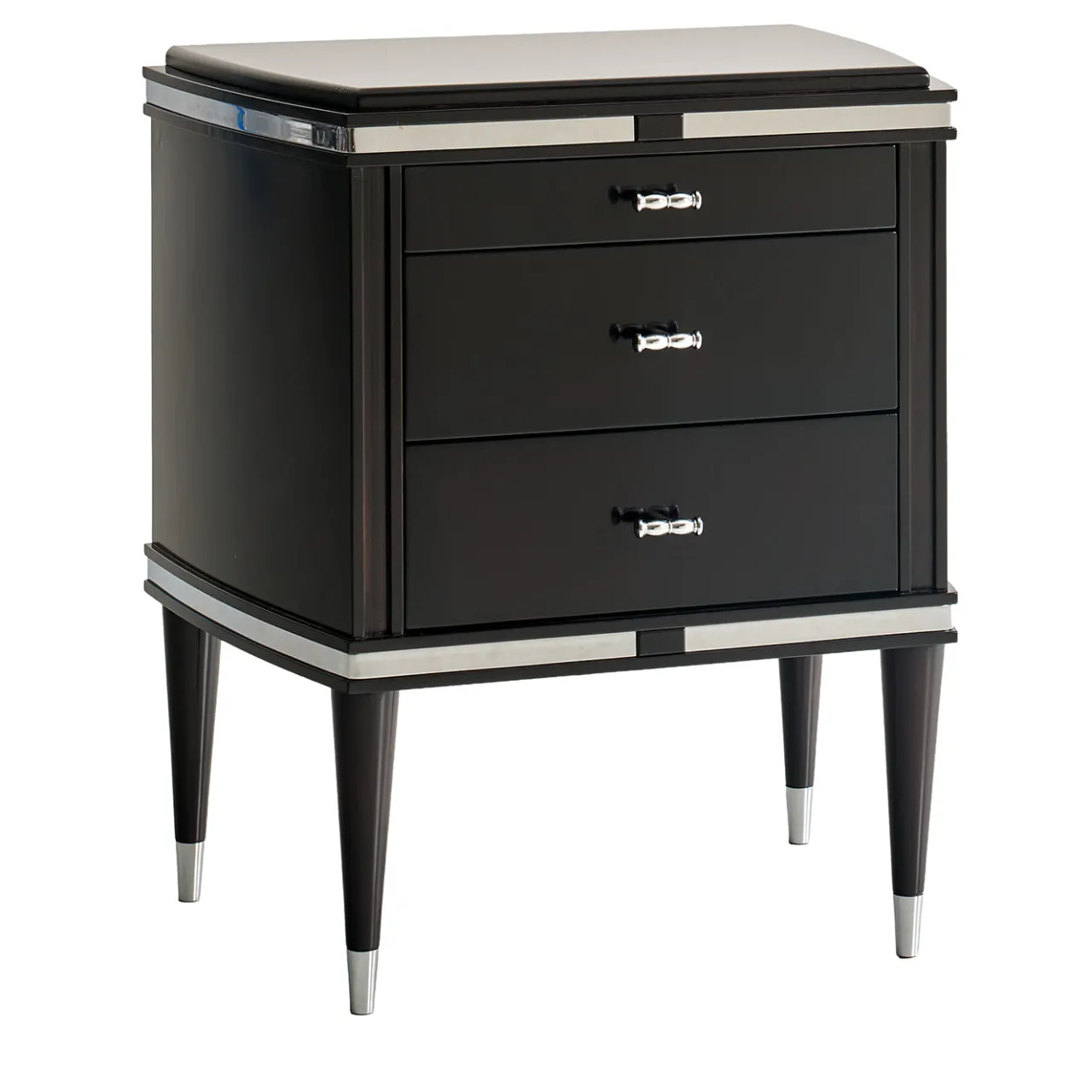 Un comodino di dimensioni medie con tre cassetti dotati di guide autoclavanti per garantire un funzionamento fluido. Il pezzo è impreziosito da maniglie in cromo opaco, piedi e profili decorativi, che esaltano il suo design elegante e contemporaneo. Le gambe angolari e le linee pulite integrano elementi classici e moderni, offrendo sia spazio di archiviazione funzionale che un’estetica raffinata per qualsiasi ambiente camera da letto.