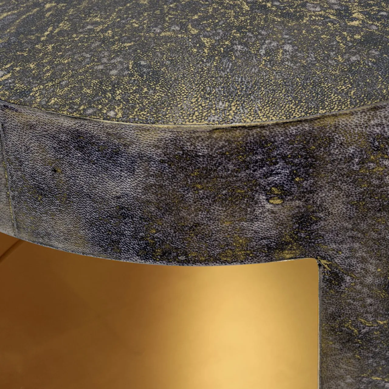 Questa versatile opera d’arte disegnata da Giannella Ventura passa senza sforzo da un elegante tavolino a un funzionale comodino. Avvolto in una lussuosa pergamena grigio grafite e minuziosamente dettagliato con scintillanti accenti in foglia d’oro, questo tavolino emana una sobria eleganza. L’esterno mette in risalto le venature naturali della pergamena, mentre l’interno vanta una lucente finitura in foglia d’oro, che dona un bagliore radioso che aggiunge bellezza e calore al suo design.