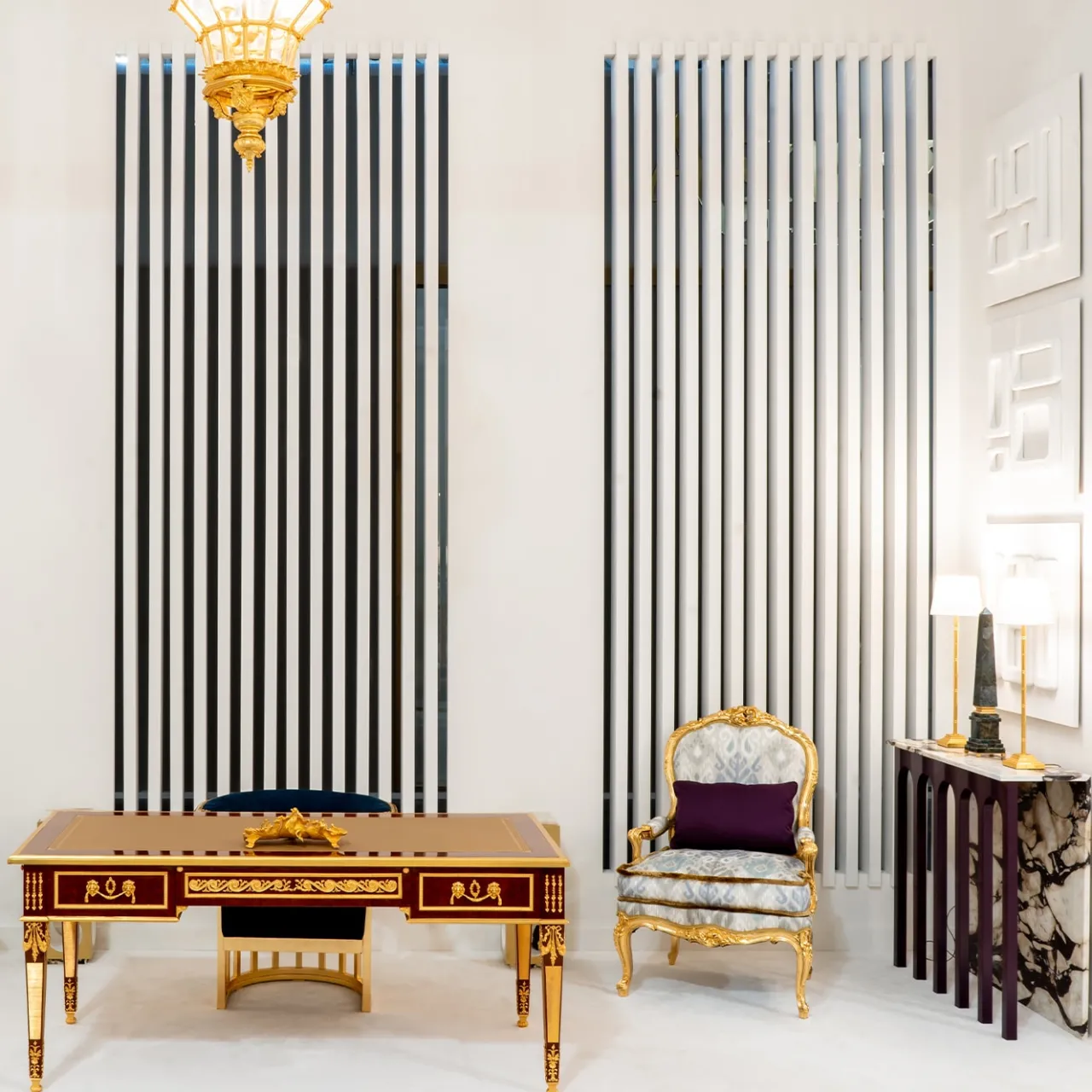 Il design eccentrico di questa consolle è un chiaro omaggio all’architettura, qui vista attraverso una lente inconfondibilmente contemporanea. La struttura a L in marmo Breccia Oniciata sfoggia tracciati irripetibili tracciati da venature che ben si armonizzano con il tono melanzana scelto per la laccatura lucida che caratterizza le sei gambe in legno che ricreano un sistema di archi.