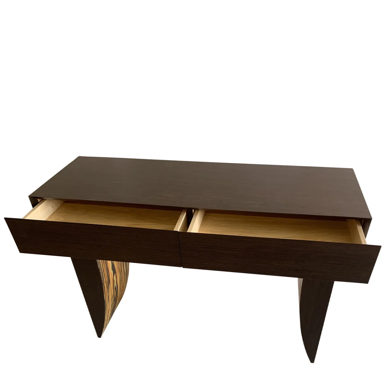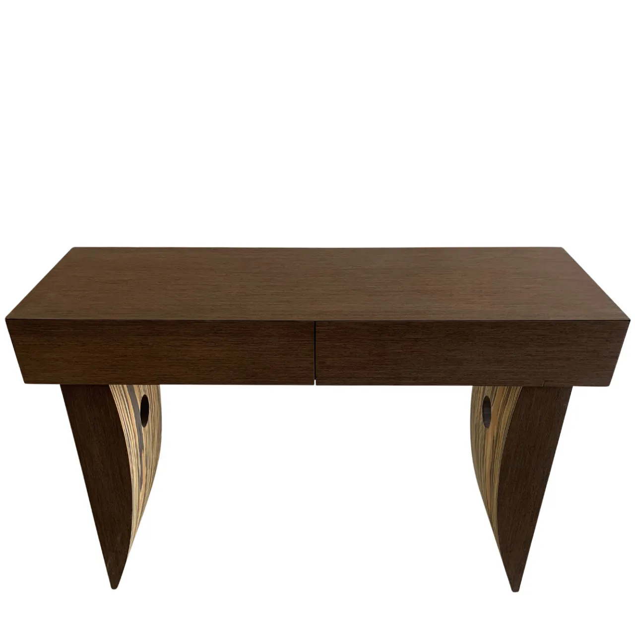 Testimonianza di un’artigianalità raffinata, questa splendida consolle in legno appartiene a un’esclusiva serie di due pezzi creata per un concorso di design italiano. Poggiata su gambe a sciabola e impreziosita da un’impiallacciatura a fiamma, presenta un robusto piano rettangolare con due cassetti, rifinito in un’intramontabile tonalità marrone scuro. Con la sua struttura leggera e il fascino dell’Art Déco, è in grado di abbellire senza sforzo un ingresso contemporaneo o classico.