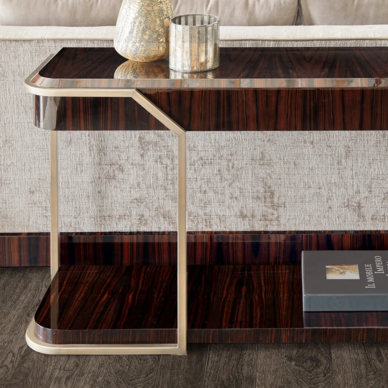 Combinando vibrazioni vintage e contemporanee, la consolle Beryl è una celebrazione del legno di ebano Macassar e delle sue sorprendenti venature naturali. Con una finitura lucida che ne esalta le venature, la consolle è completata da una cornice color bronzo. Con un ripiano superiore e uno inferiore, la console è perfetta per esporre libri e vasi.