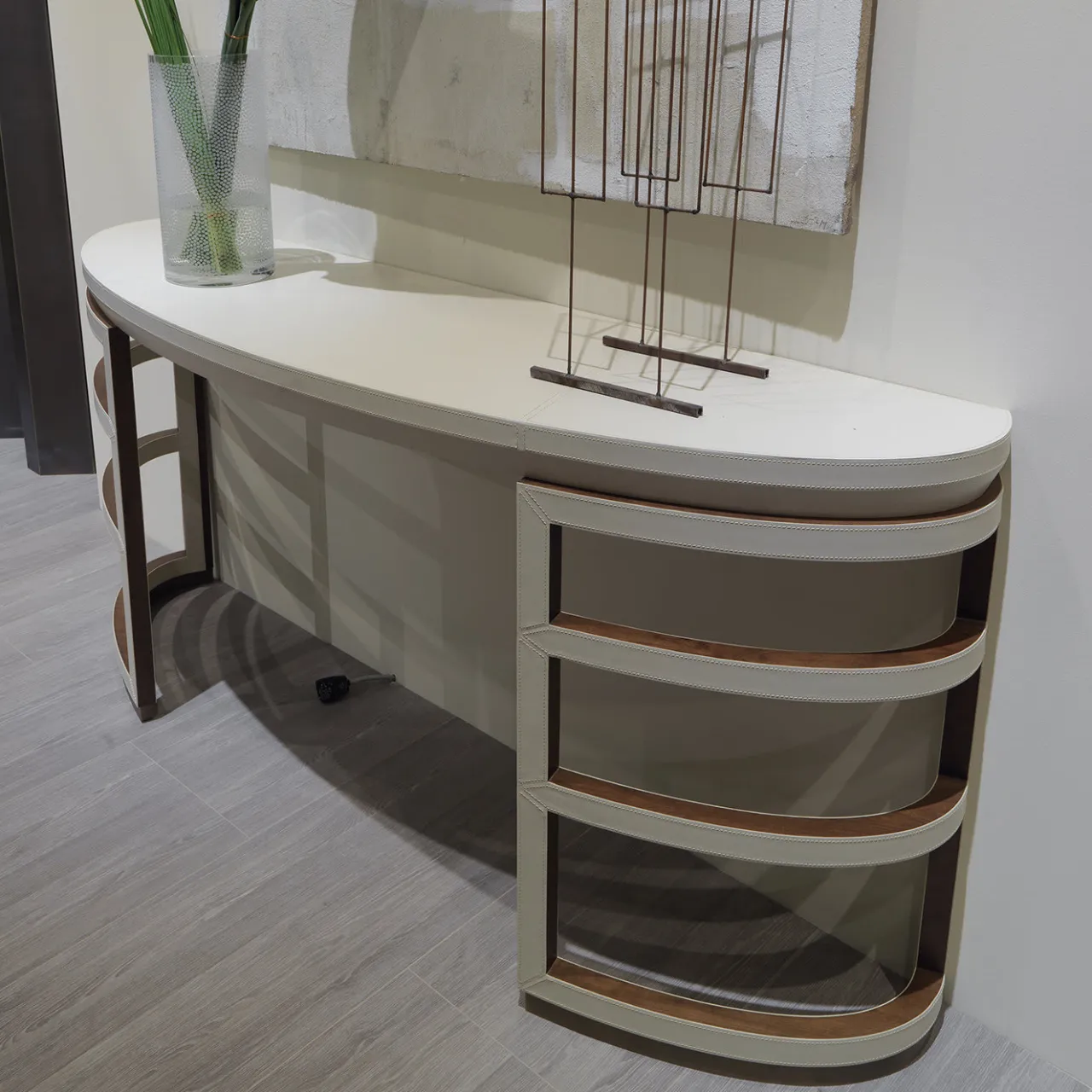 L’esecuzione magistrale delle tecniche artigianali esemplificate da questa elegante consolle la rende un complemento perfetto per gli interni moderni, sia commerciali che residenziali. La sua elegante silhouette in legno combina una struttura a scheletro curvo dove gli elementi orizzontali di supporto e il piano curvo sono rivestiti in pelle delicata, aggiungendo un dettaglio di lusso di alto valore estetico.