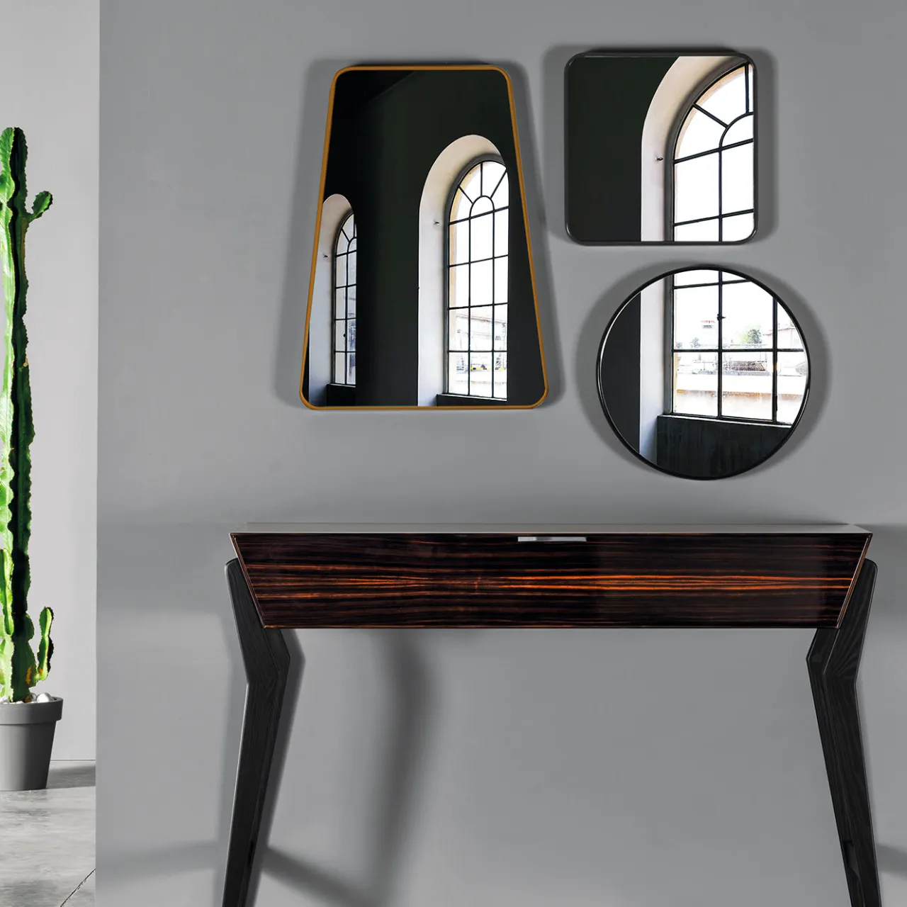 Audace e scultorea, questa elegante consolle è un pezzo iconico del catalogo Meroni e Colzani, che vanta un look retro-chic ottenuto con una tecnologia innovativa. Le gambe sono in frassino tinto nero e sostengono un piano in ebano lucido dotato di un cassetto con maniglia in metallo cromato. Le gambe sono disponibili anche in noce canaletto opaco; chiedete al Concierge i dettagli e i prezzi di queste opzioni.