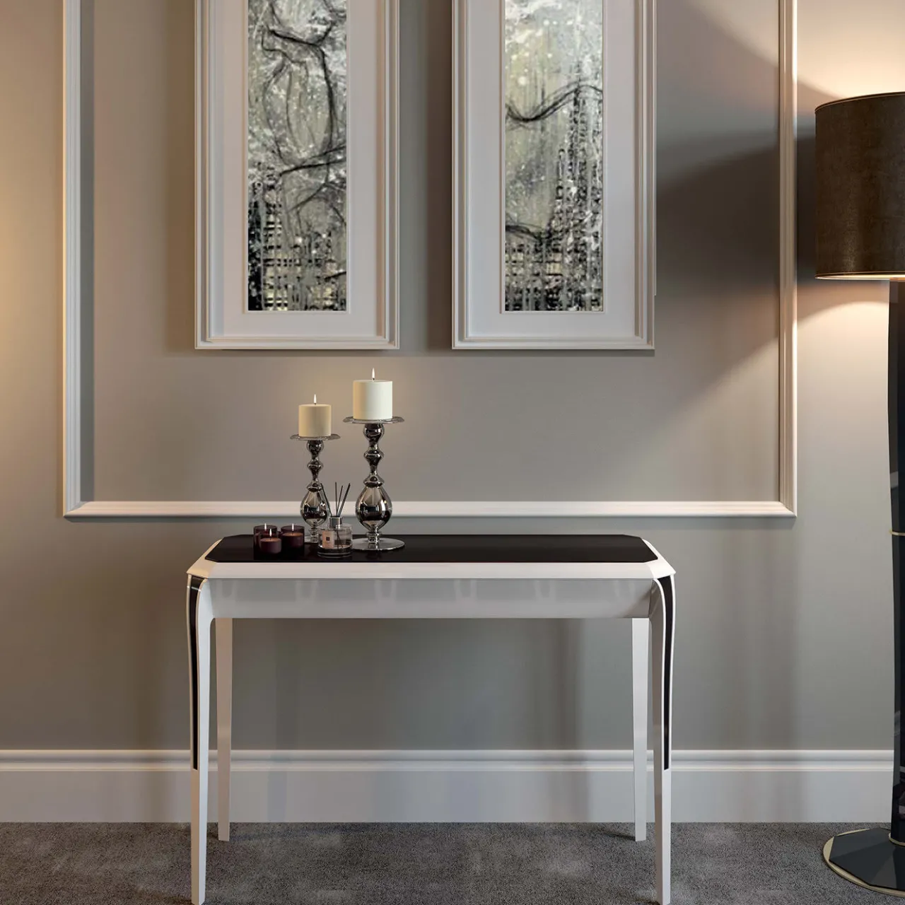L’eleganza discreta di questa consolle è data dalla finitura bianca laccata lucida e dai dettagli in pelle nera con striature marroni sul piano e sulle gambe, che aggiungono un contrasto testuale di grande fascino visivo. Caratterizzata da una struttura rettangolare in legno con gambe sottili ed eleganti, questa consolle dallo stile chiaro si adatta a interni sia classici che contemporanei. Con il suo profilo stretto e la sua forma semplice ed elegante, questa consolle sarà un’aggiunta originale a un salotto moderno, a un ufficio o a un ingresso.