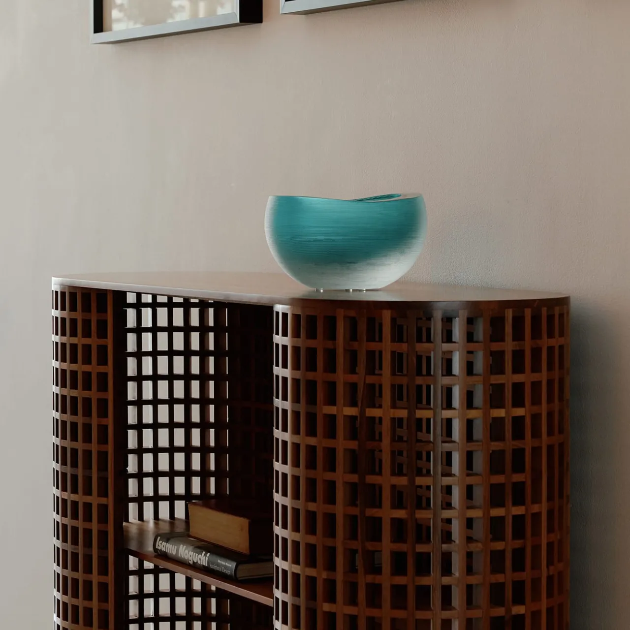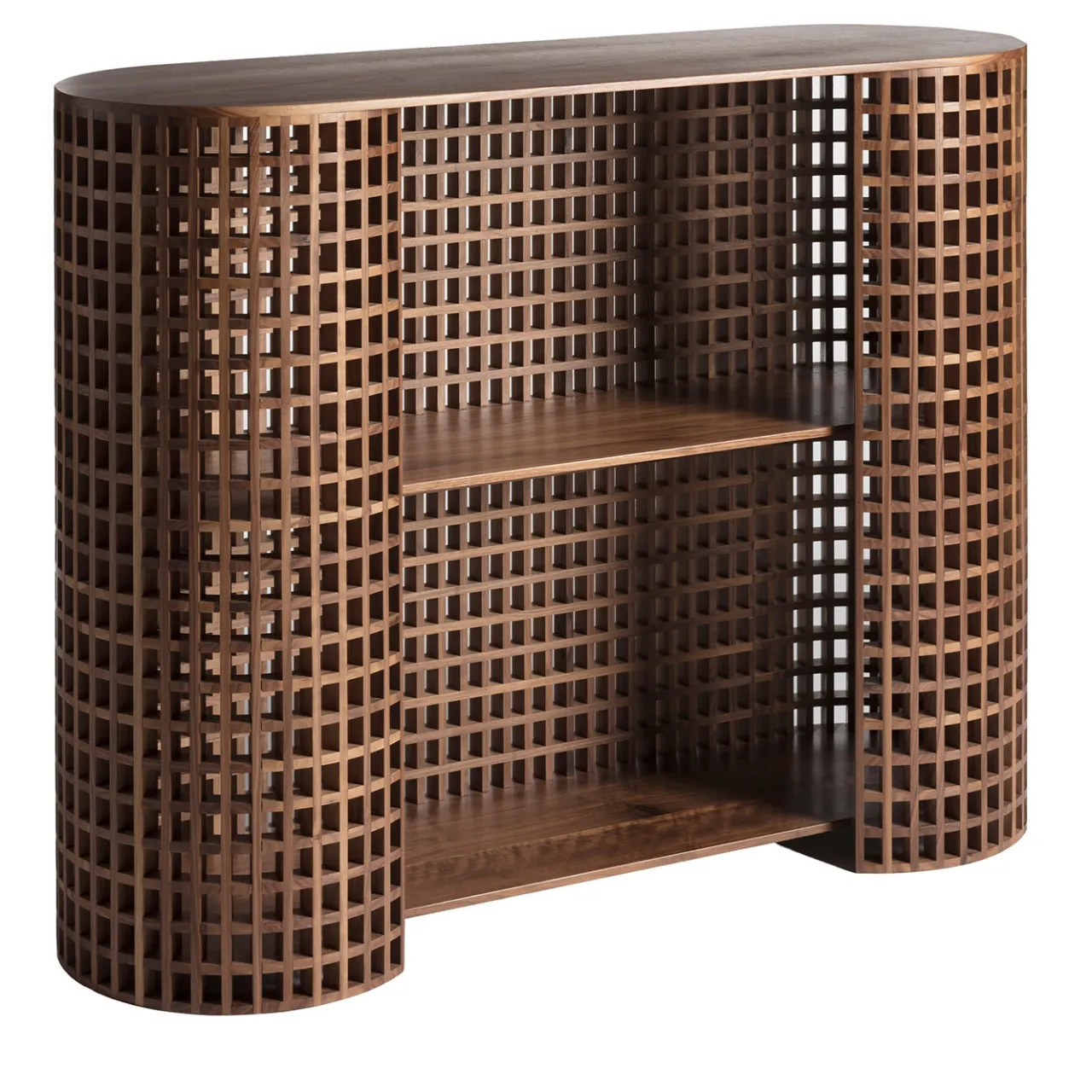 Il design arioso ed elegante che contraddistingue questa consolle a giorno la rende un complemento ideale per arredamenti moderni dai toni caldi. Realizzata in massello di noce canaletto, è interamente lavorata a mano e il suo disegno a griglia produce un seducente impatto visivo che ben si armonizza con le linee morbide degli elementi laterali cilindrici. Le fasi finali di spazzolatura e applicazione della vernice trasparente ne sigillano l’aspetto. Su richiesta è disponibile anche una variante in legno di tiglio. Questo pezzo è attualmente in mostra e immediatamente disponibile presso la Galleria Artemest di New York.