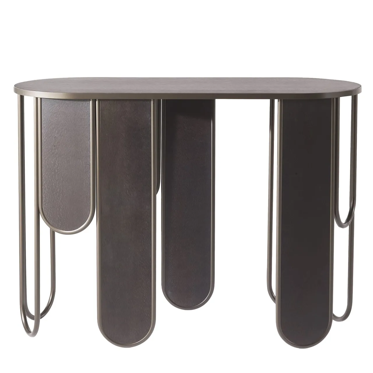 Un gioco di elementi dalla forma fluida e armoniosa contraddistingue la consolle Chandra. L’elaborata struttura, composta da elementi tubolari con base arrotondata, presenta una successione di pannelli vuoti e rivestiti in Carbalho: un dettaglio che conferisce un particolare dinamismo al pezzo. La stessa essenza è utilizzata per il piano, esaltato dalla tinta wengé scura e opaca. Consolle Chandra con struttura in tubo di ferro con finitura Dark Bronze. Supporto del piano in ferro con finitura Dark Bronze.