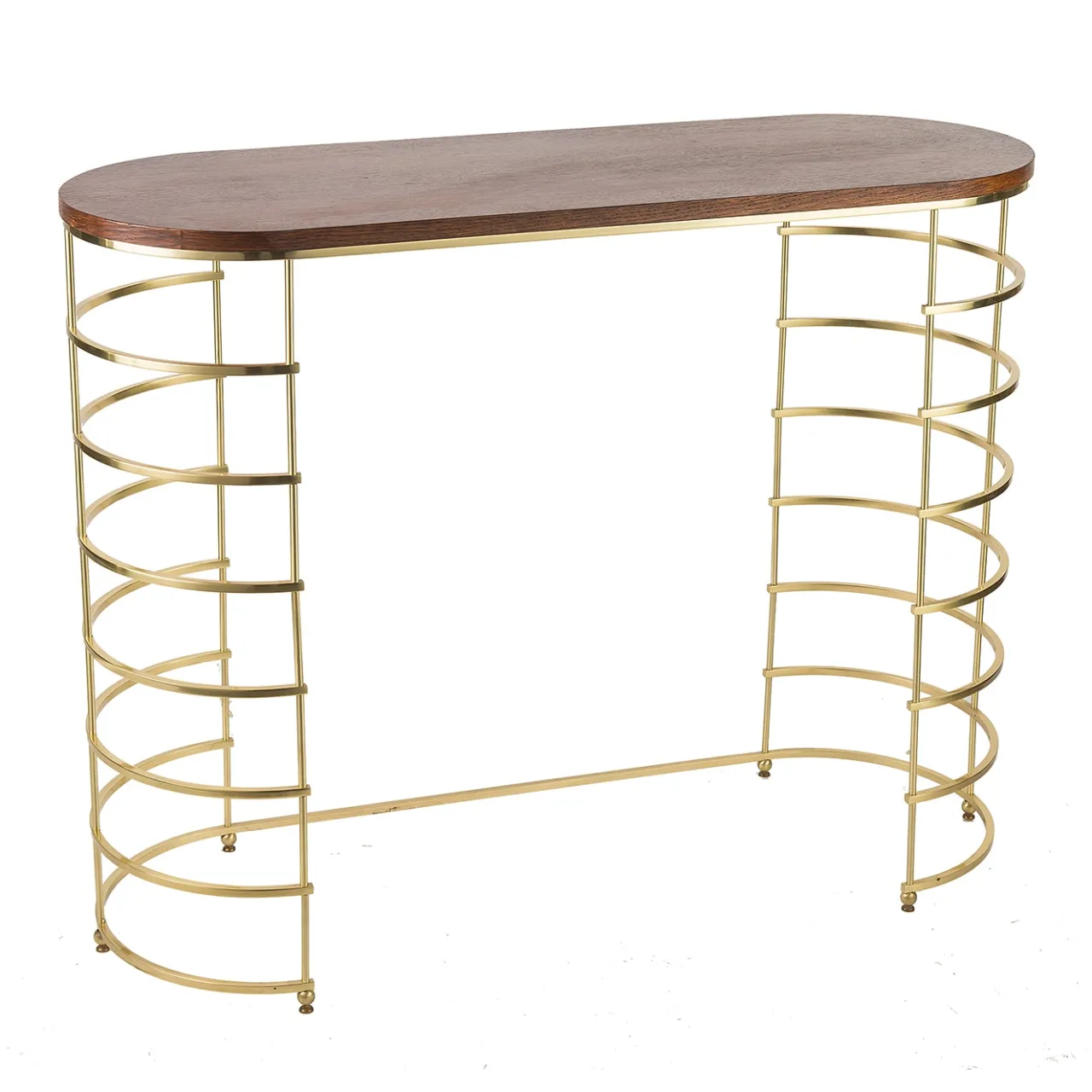 La consolle “Circle” è un design senza tempo che fonde senza sforzo l’estetica moderna con elementi classici. La sua struttura è realizzata in ottone protetto, che le conferisce un’atmosfera calda e lussuosa. Il piano in rovere marrone massiccio aggiunge un tocco di bellezza naturale e fornisce una superficie robusta.
