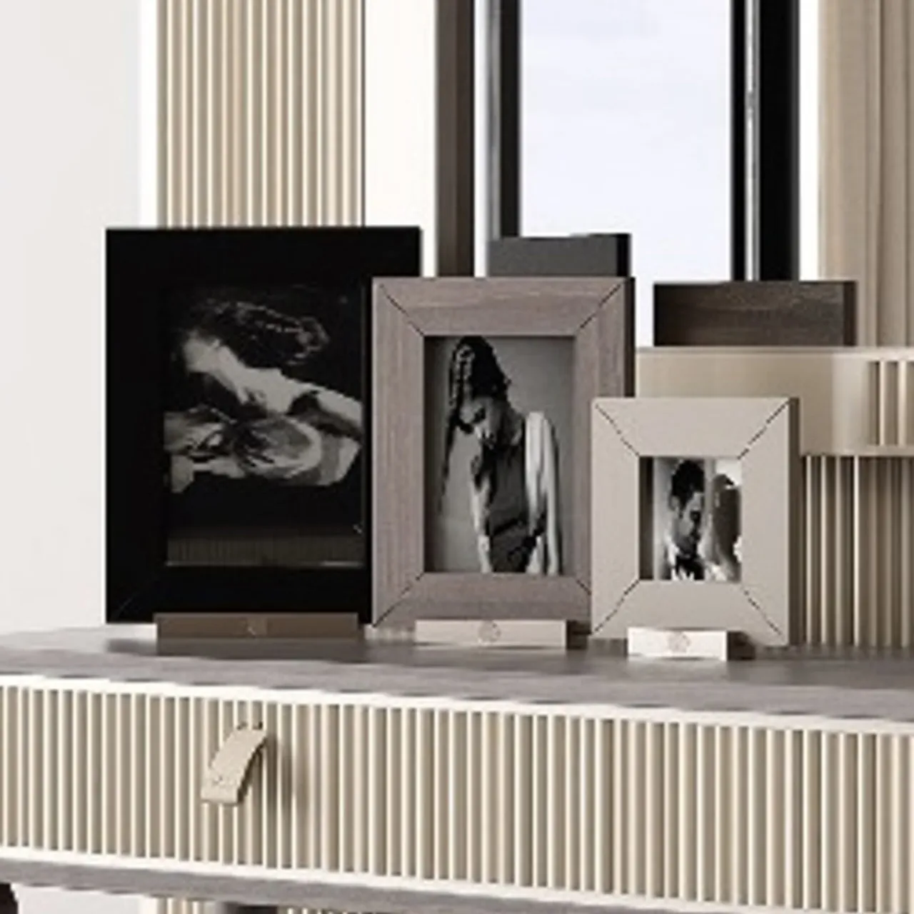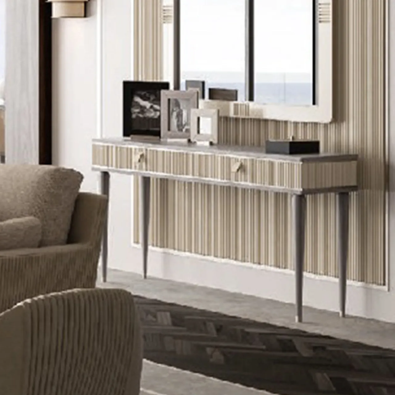 Questo raffinato set di consolle e specchiera, che colpisce per la sua semplicità, sarà un elemento di grande effetto in un ingresso. Sostenuto da piedi conici accentati da ghiere metalliche con finitura in ottone, il mobile rettangolare è incorniciato da un intarsio di legno impiallacciato in un’elegante tonalità di grigio. Due ampi cassetti in legno laccato beige con fusti scanalati, finitura vellutata e maniglie in pelle completano questo mobile, creando un effetto di contrasto visivo moderno e versatile. Il grande specchio (110 x 110 cm) ha una cornice in legno laccato beige con angoli arrotondati e piccoli intarsi su ogni lato.