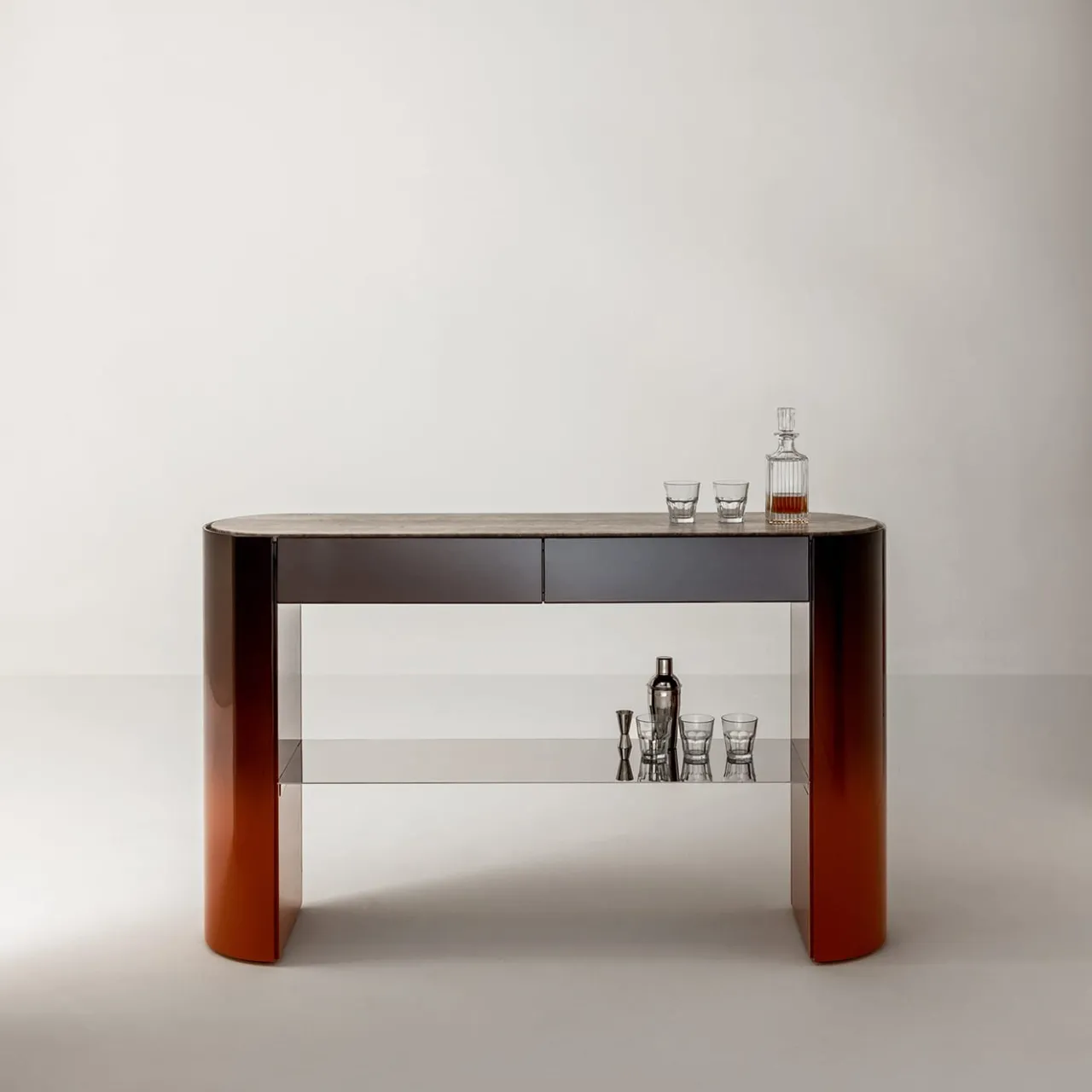 Consolle in lacca lucida sfumata RAL 8004, con piano superiore in marmo Travertino grigio e ripiano inferiore in acciaio lucidato a specchio. Dotata di due cassetti sotto il piano superiore. Le gambe sono dotate di ante apribili attrezzate e di ripiani interni. Ispirata all’iconico mobile contenitore Collectionist, la consolle adotta un design morbido e curvilineo, ideale per creare un angolo bar in casa di alto livello. Ogni dettaglio è stato studiato per garantire una funzionalità raffinata, dove comfort e bellezza si fondono perfettamente.