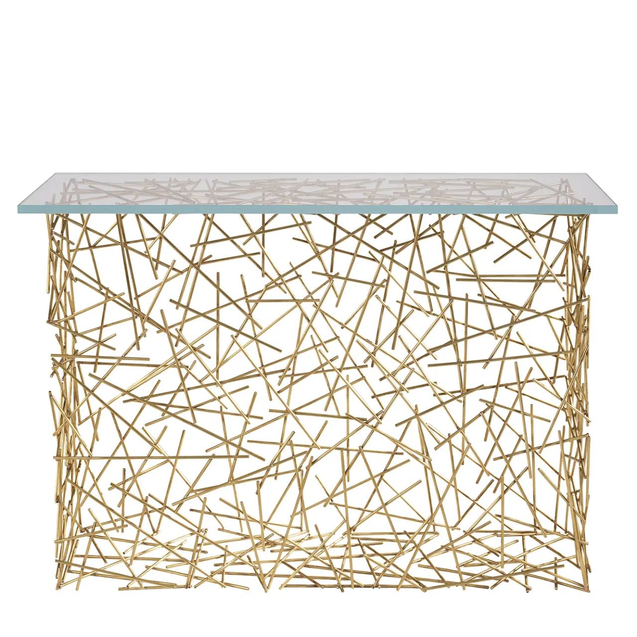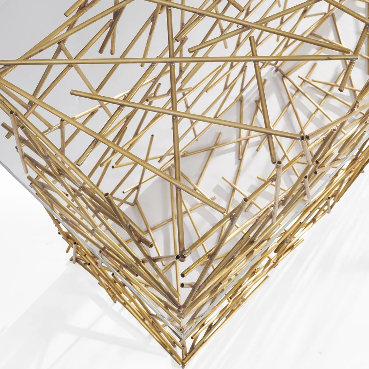 Questa consolle presenta una struttura dinamica composta da tubi di ottone di dimensioni diverse, che creano un intricato effetto a reticolo. Sormontata da una superficie in vetro extrachiaro, offre al tempo stesso resistenza e senso di apertura. Il design bilancia la complessità artistica con l’eleganza funzionale, rendendola adatta a interni sofisticati. Questa consolle si adatta bene agli ingressi o agli spazi abitativi, fungendo da elemento di spicco.