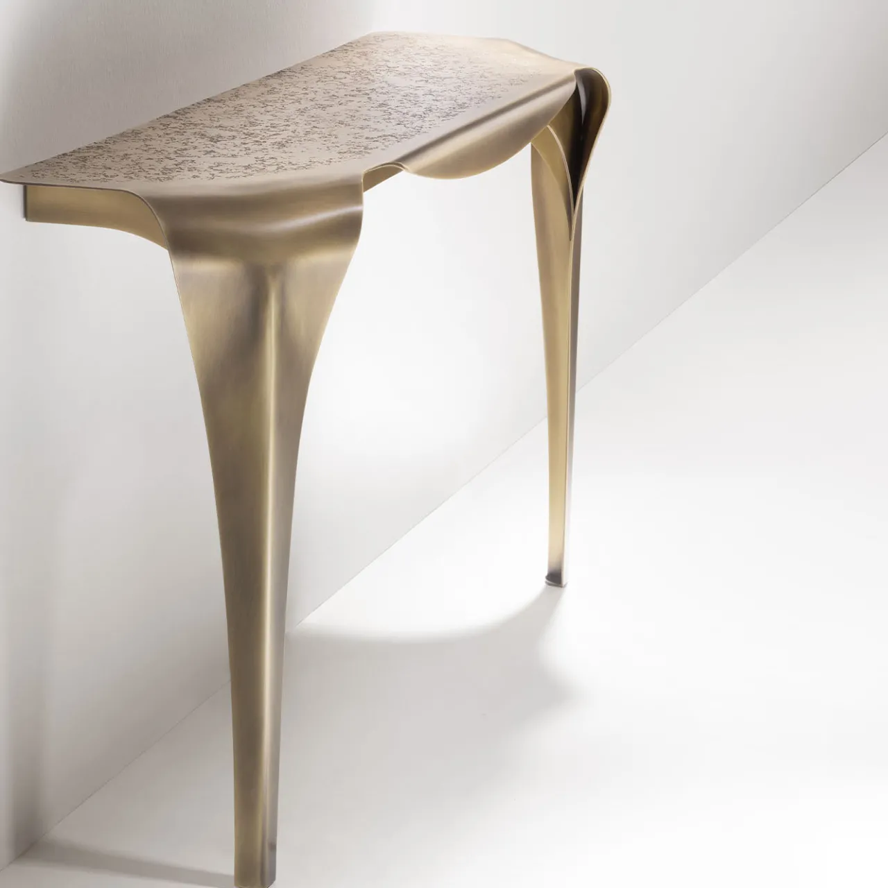 La console Convivium di Nikita Bettoni presenta una silhouette curvilinea, progettata per appoggiarsi con grazia a una parete. Realizzata interamente in ottone, mette in mostra gambe fluide e curve che evocano un senso di movimento continuo. La finitura distintiva DeErosion aggiunge texture e profondità, rendendo questa console di dimensioni medie un pezzo d’impatto per interni contemporanei.