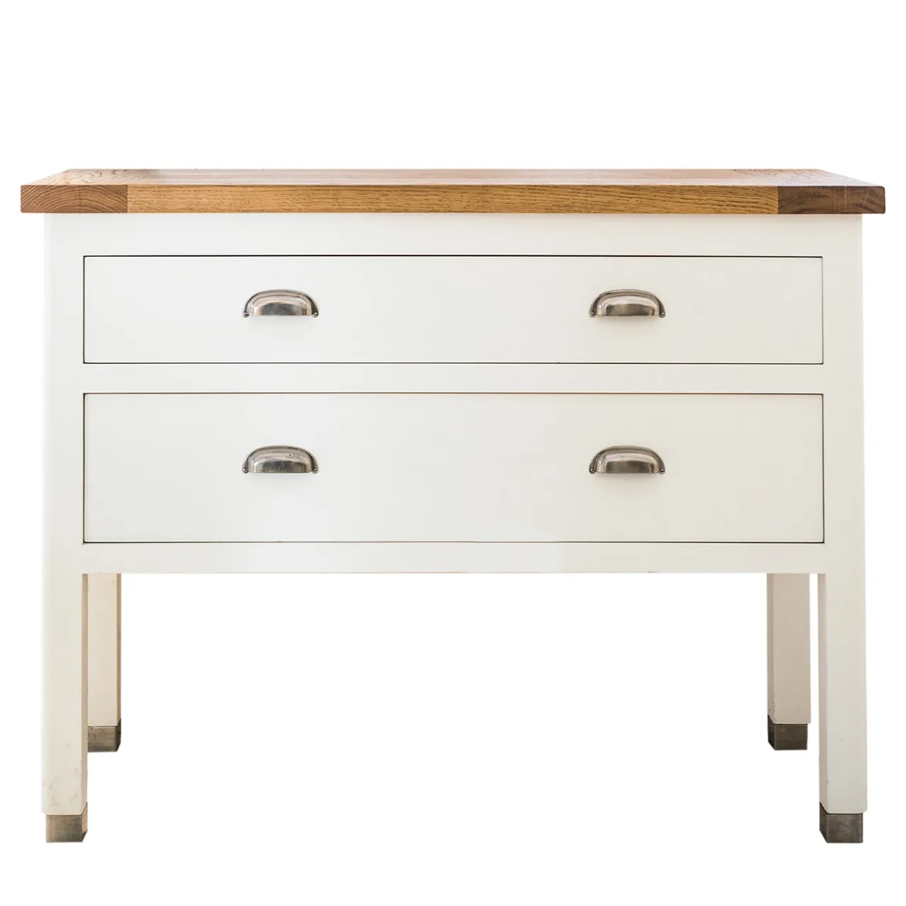 Questa elegante consolle aggiungerà un accento delicato a un ingresso, un corridoio o un soggiorno contemporaneo. Realizzata artigianalmente in legno di tiglio bianco con piano in rovere, è laccata a mano e conferisce al pezzo una texture morbida e preziosa. Rigorosamente lineari, i due cassetti sono arricchiti da quattro maniglie in ottone laccato acciaio dalla sinuosa forma di conchiglia. Le gambe dritte sono completate da piedini in metallo, che sottolineano il fascino vintage di questo singolare design. Interamente personalizzabile su richiesta.