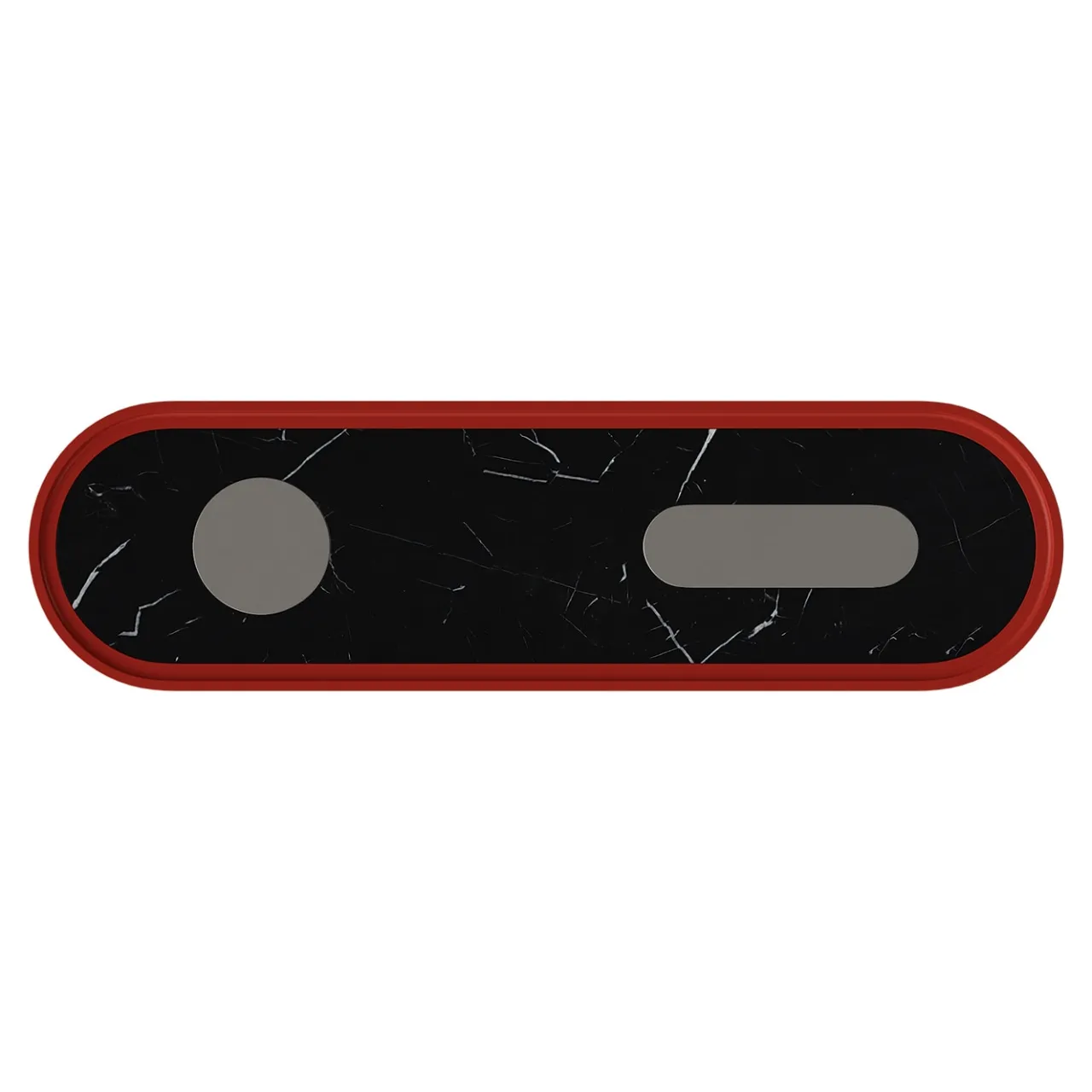 Parte della serie Creta, questa consolle è completamente laccata in finitura opaca R/rosso corallo con una gamba rotonda e una ovale. Il piano sagomato è arricchito da un inserto in marmo nero Marquinia e da alcuni dettagli in inox satinato.