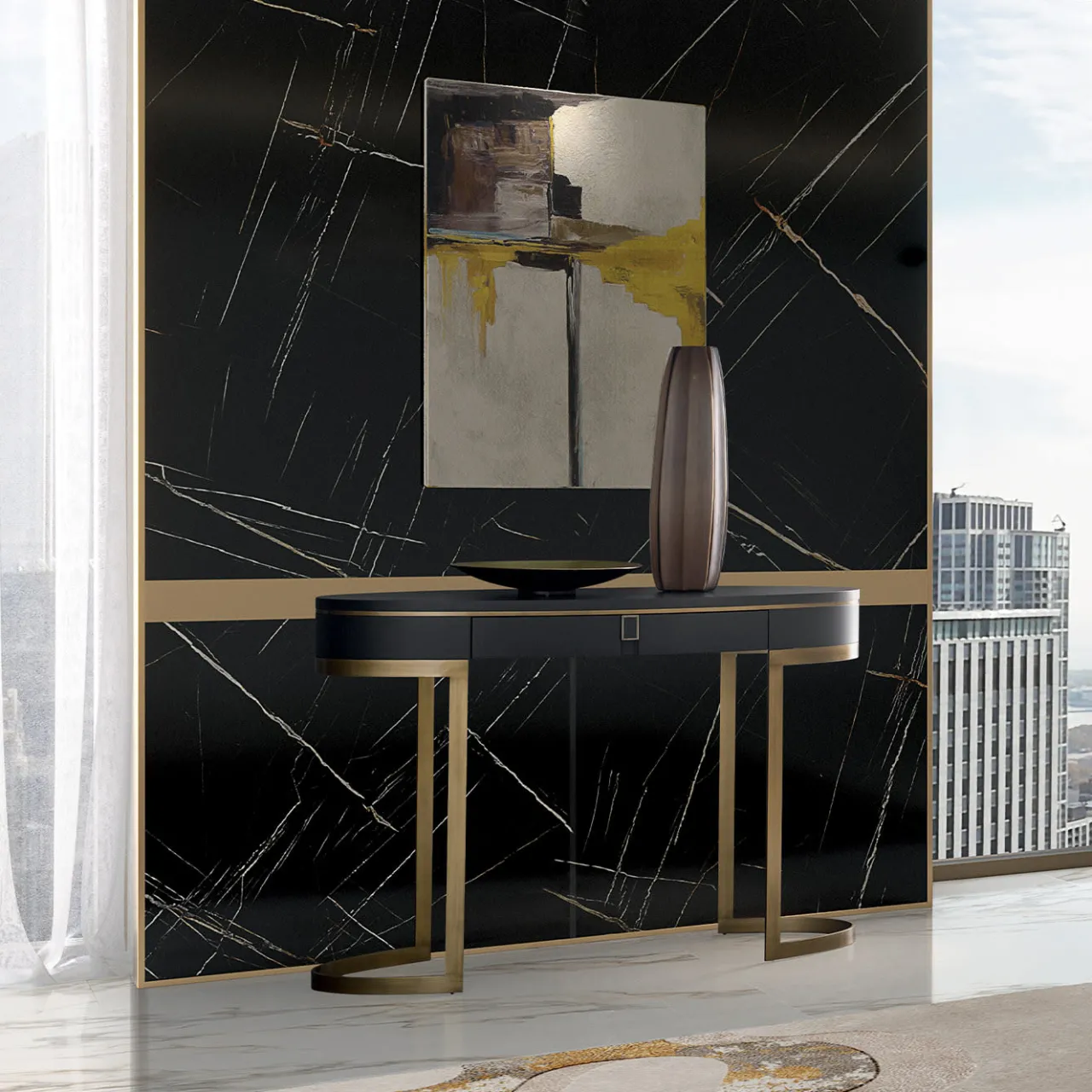 La consolle Diamond è un esempio di raffinata maestria artigianale e design elegante. La sua forma curva in legno laccato opaco si appoggia con grazia su una base in metallo bronzato, creando un equilibrio perfetto tra il legno liscio e i caldi accenti metallici. Il cassetto singolo, rivestito in legno chiaro, scorre senza fatica su guide a chiusura morbida, unendo eleganza e praticità. Ideale per ingressi, soggiorni o sale da pranzo, questa consolle diventa un elegante punto di riferimento.