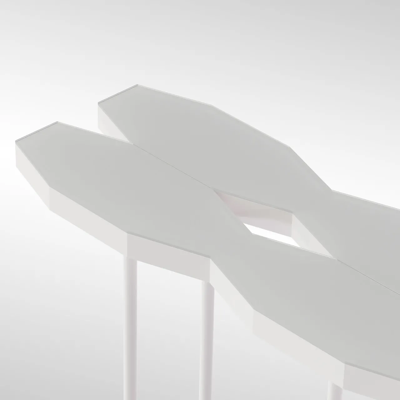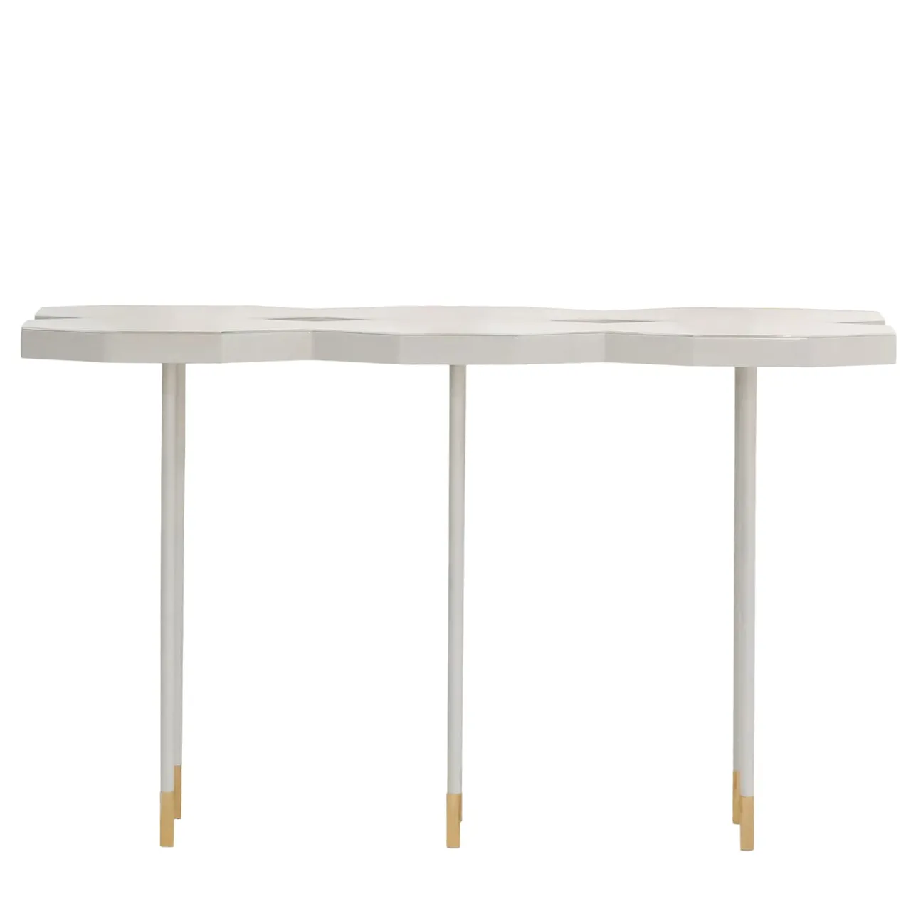 Un pezzo d’accento iconico e sofisticato per l’ingresso di un interno in stile contemporaneo, questa consolle sfoggia un raffinato design scultoreo. Poggiata su sei gambe in ottone laccato bianco opaco arricchite da punte placcate in oro 18 carati, presenta un caratteristico piano poliedrico esagonale con due inserti romboidali aperti, realizzati in vetro retrolaccato.