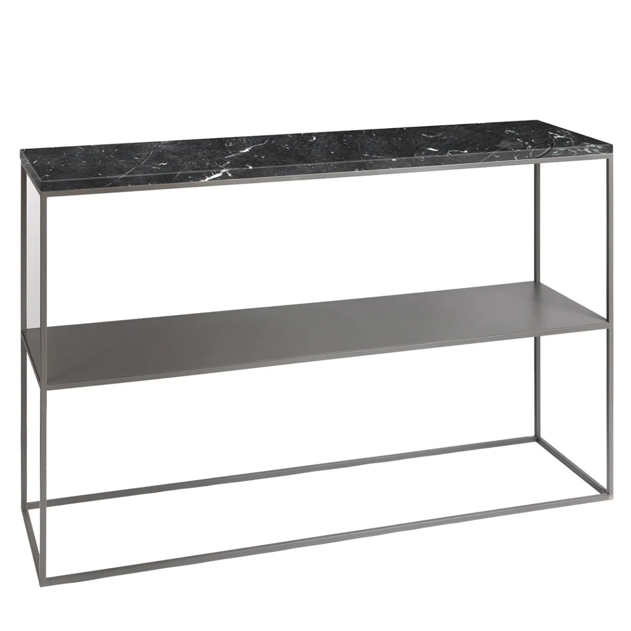Squisito esempio di sobria eleganza, questa consolle in stile contemporaneo farà bella mostra di sé all’ingresso di un ambiente residenziale o commerciale. Realizzata a mano in ferro laccato grigio, la base dalle linee pulite è dotata di un ampio ripiano che offre ulteriore spazio espositivo insieme allo spesso piano in marmo nero statuario Marquina, caratterizzato da brillanti venature. Personalizzabile nella finitura del metallo e nel tipo di marmo, contattare il Concierge per i dettagli.