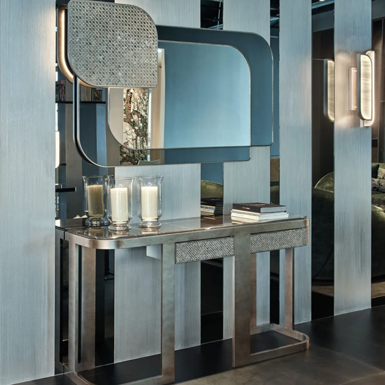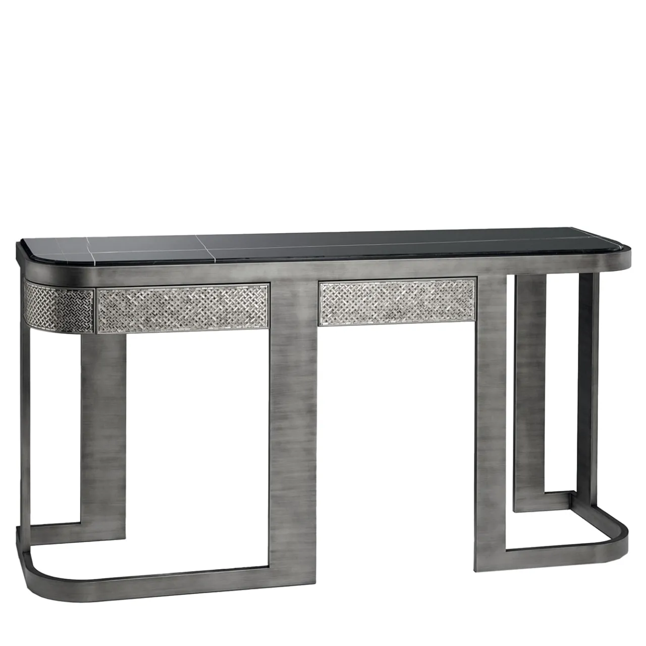 Questa elegante consolle ha una struttura in metallo con finitura in vernice anticata. Il cassetto anteriore è decorato con un mosaico artistico e il cassetto interno è rivestito in tessuto di microfibra.