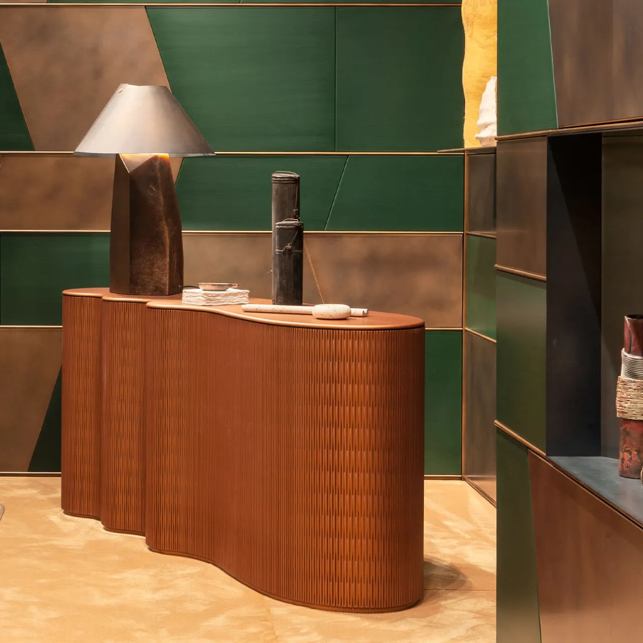 Linee snelle e sinuose, dal carattere inedito, contraddistinguono l’estetica raffinata della consolle Infinity, un accento iconico per un ingresso o un living contemporaneo. Realizzata in legno con finitura ocra, arricchita da piccoli fori a motivo e da un piano liscio, è interamente personalizzabile nel colore. Per ulteriori dettagli, consultare il Concierge.