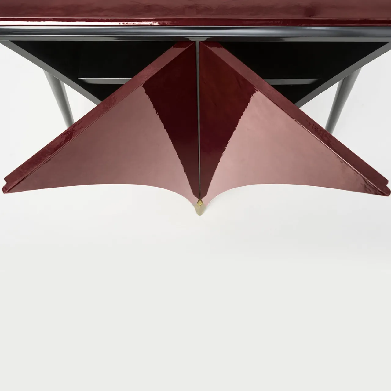 Elegante e dal design unico, il tavolo consolle Liù presenta una parte centrale e un piano in pergamena di capra rossa lucida. La gamba laterale e il bordo sono laccati in nero opaco, mentre la gamba centrale è impreziosita da una foglia d’oro ossidata per un tocco di eleganza e finezza. Questo articolo aggiungerà carattere e classe a qualsiasi ambiente.