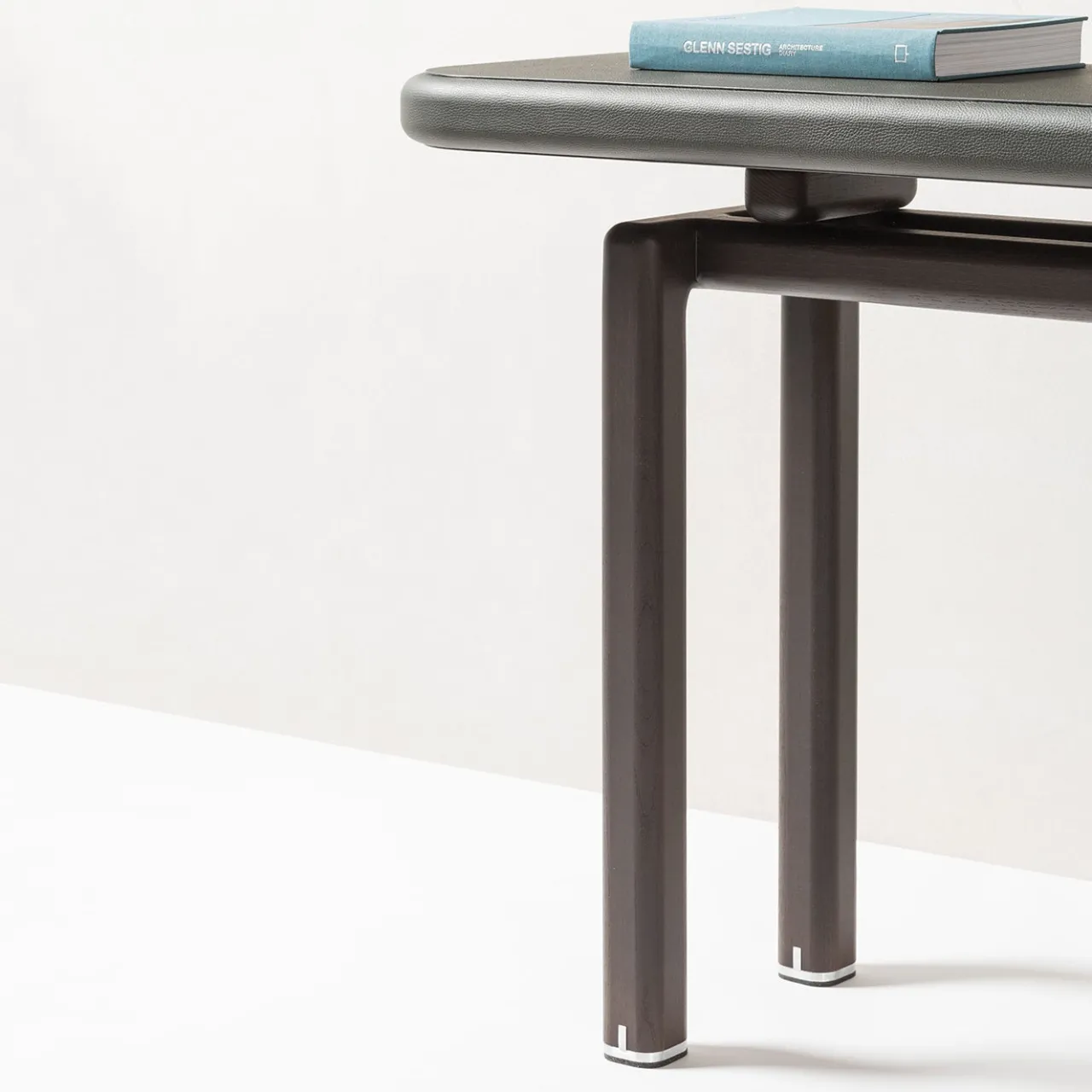 Realizzato in pelle e legno di noce canaletto tinto scuro. È dotato di piedini decorativi in acciaio inox. Misure personalizzate disponibili su richiesta.
