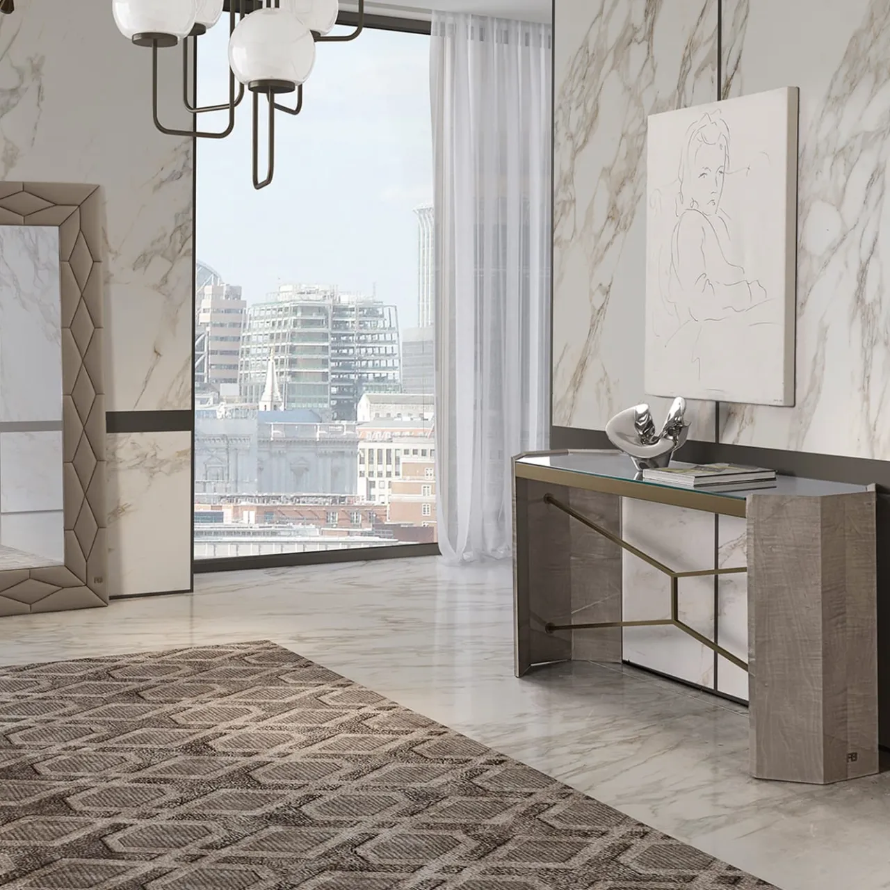 Accattivanti profili geometrici conferiscono a questa consolle un look scultoreo, reso ancora più intrigante da una raffinata combinazione di materiali. Rigorosamente scolpiti per ottenere un profilo a mezzo esagono, i fianchi abbracciano il piano in vetro trasparente sagomato e sfoggiano una pregiata impiallacciatura in sicomoro fiddleback. Arricchito da un inserto centrale arioso e dinamico, il pezzo è completato da elementi metallici in ottone brunito alla base del piano. Non richiede montaggio.