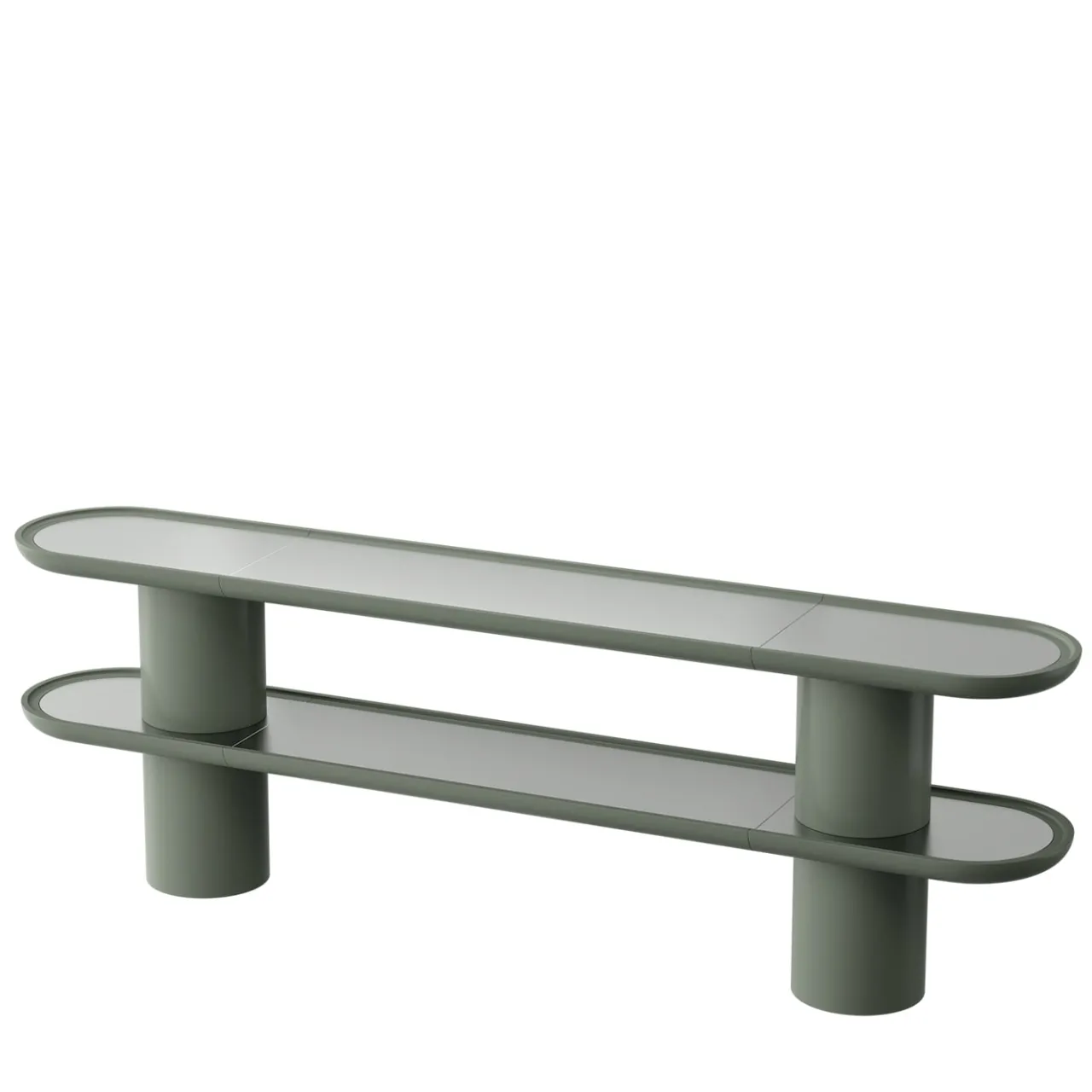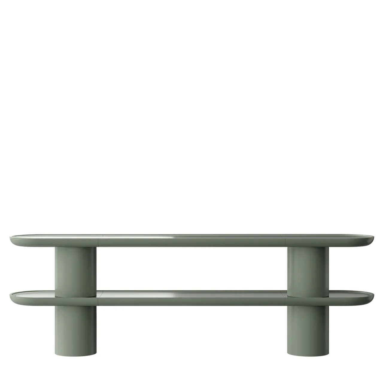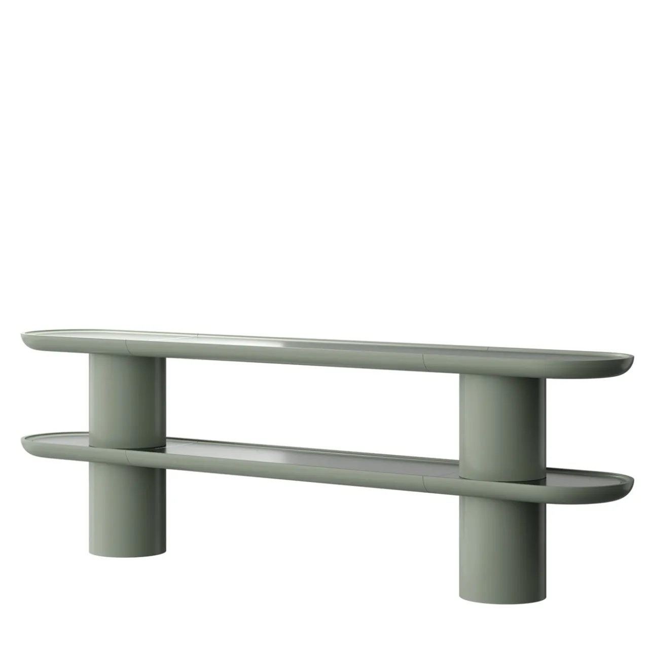 Profili lineari e curve armoniose disegnano l’elegante silhouette di questo moderno porta TV. Tenuti insieme da due elementi a colonna, i due ripiani sono definiti da fianchi curvi che sottolineano lo spirito generoso del pezzo. Rifinito in una delicata tonalità di verde salvia, il design è disponibile anche in una varietà di opzioni modulari da esplorare contattando il Concierge.