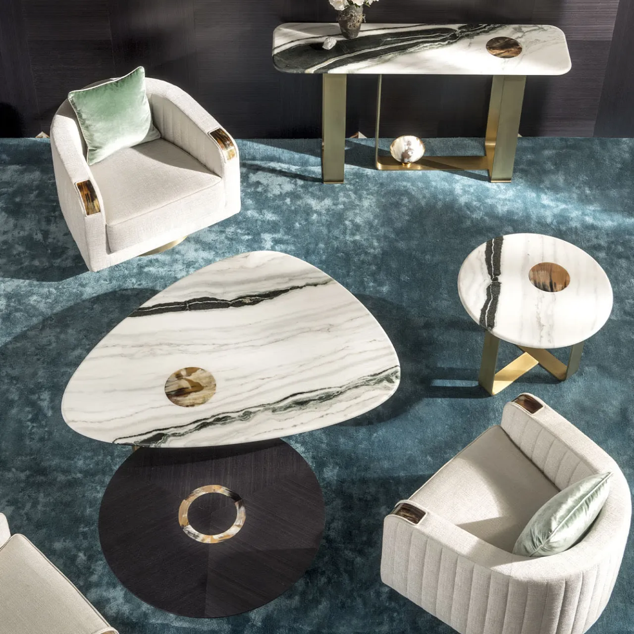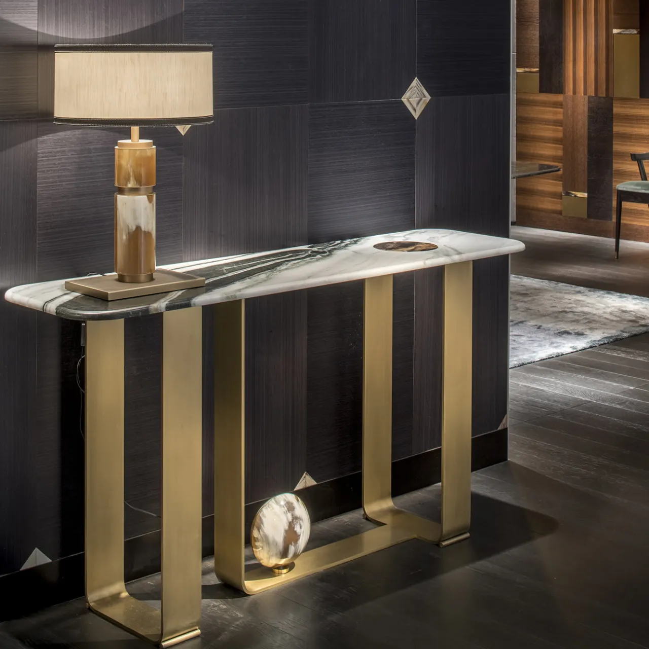 Questa superba consolle è un pezzo scultoreo che impreziosisce un ingresso o un soggiorno moderno con un’eleganza sofisticata e una suggestiva giustapposizione di materiali, colori e texture diverse. Il piano rettangolare con angoli arrotondati è realizzato in marmo Stelvio con finitura satinata e vanta un inserto in corno lucido di forma rotonda che rispecchia il disco decorativo fissato alla base in metallo bronzato (disponibile anche in ottone brunito). Disponibile anche in marmo di Carrara o Cartagine: chiedete al Concierge i dettagli e i prezzi di queste opzioni.