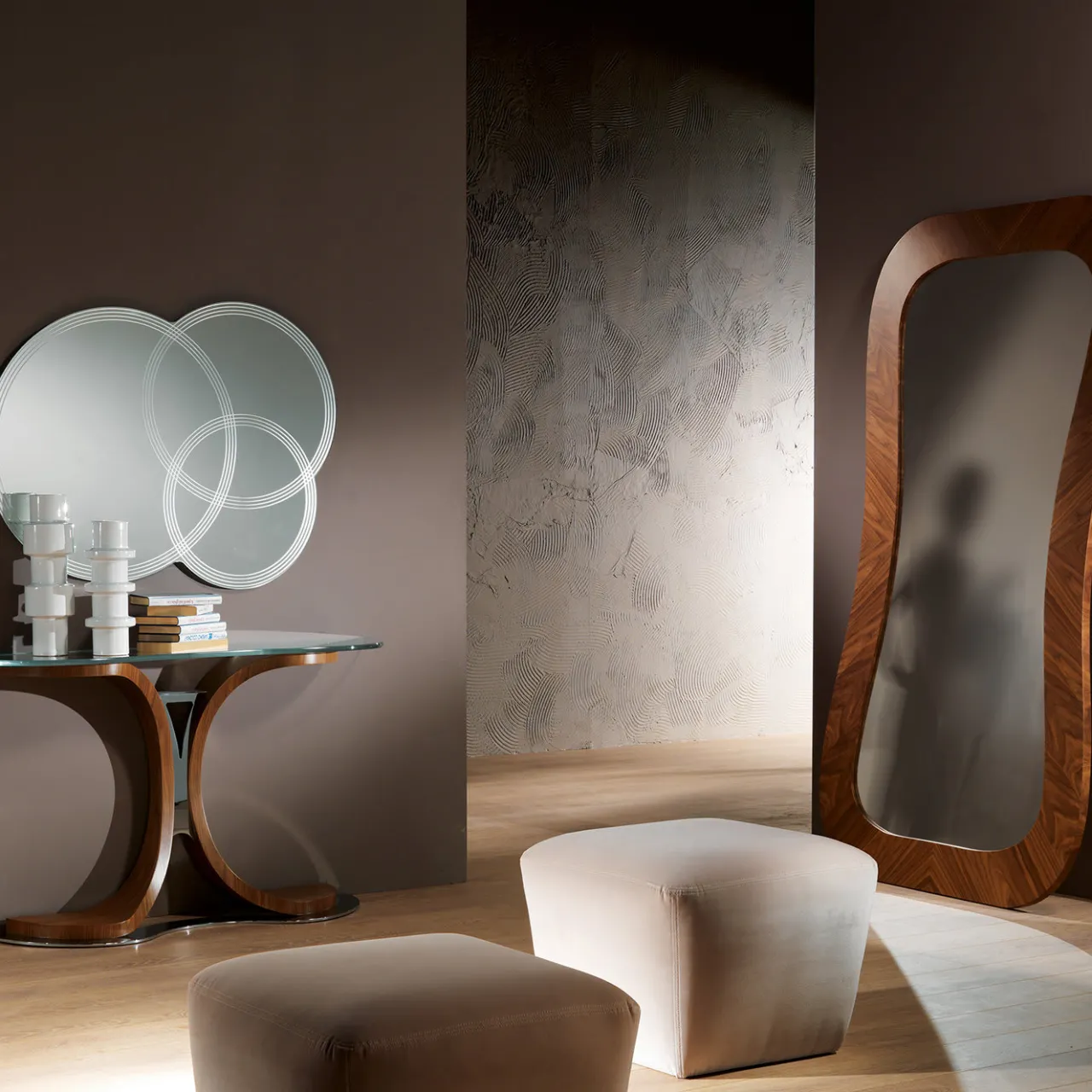 Originale console per spazi moderni, Mistral vanta curve dolci e materiali naturali. Realizzata in noce canaletto, è impreziosita da metallo cromato e sormontata da un piano ovale in vetro. Il pezzo fa parte di una piccola collezione di pezzi complementari, che permettono di creare un tema sottile in tutta la casa.