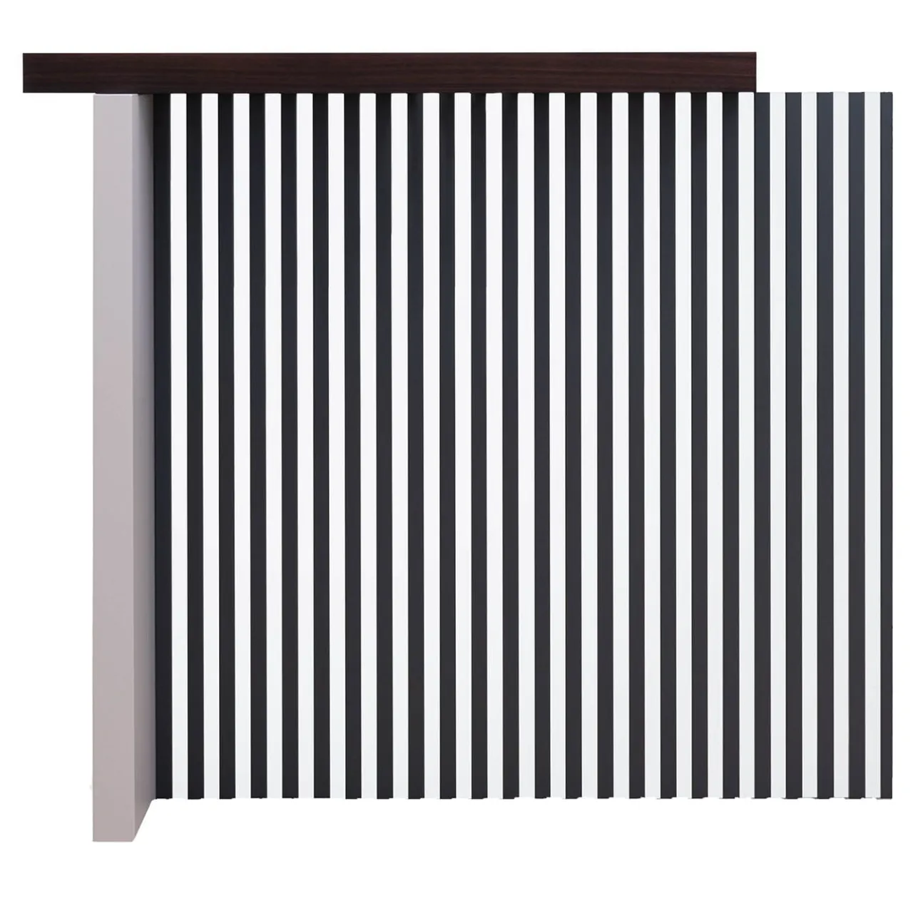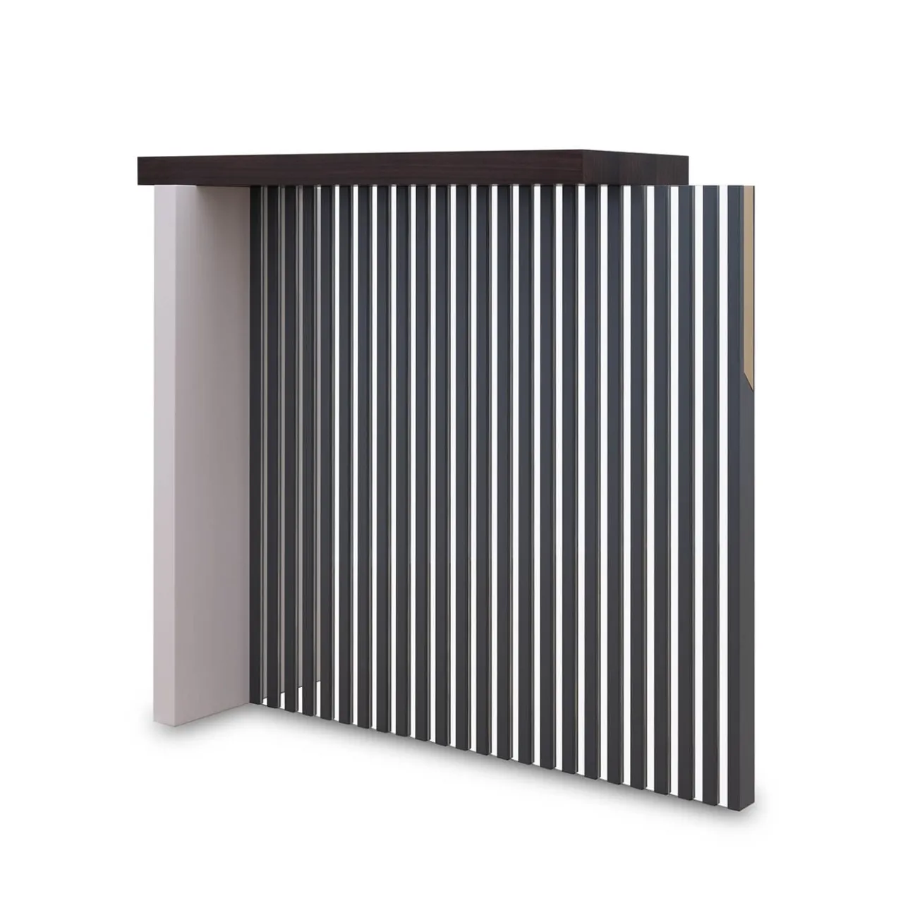 Versatile e sofisticata, dal design contemporaneo, questa consolle è adatta all’ingresso, al corridoio o al soggiorno di una casa, da personalizzare con una pianta, una lampada o un vassoio vuoto. Realizzata con due pannelli in legno laccato e coronata da un piano in legno di eucalipto, presenta un inserto laterale in ottone satinato e un sorprendente piano intricato per ospitare lamelle a specchio che catturano e riflettono l’ambiente circostante.