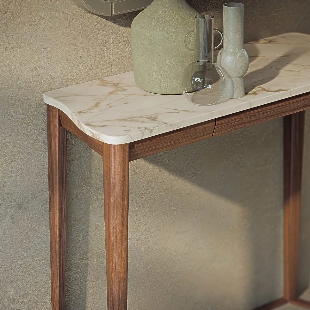 Consolle rivestita in Tay scuro con cassetto con meccanismo push and pull. Gambe in legno massiccio in tinta Tay scuro. Disponibile anche nella versione Noce Canaletto. Piano in marmo Calacatta oro opaco, disponibili altre varianti.