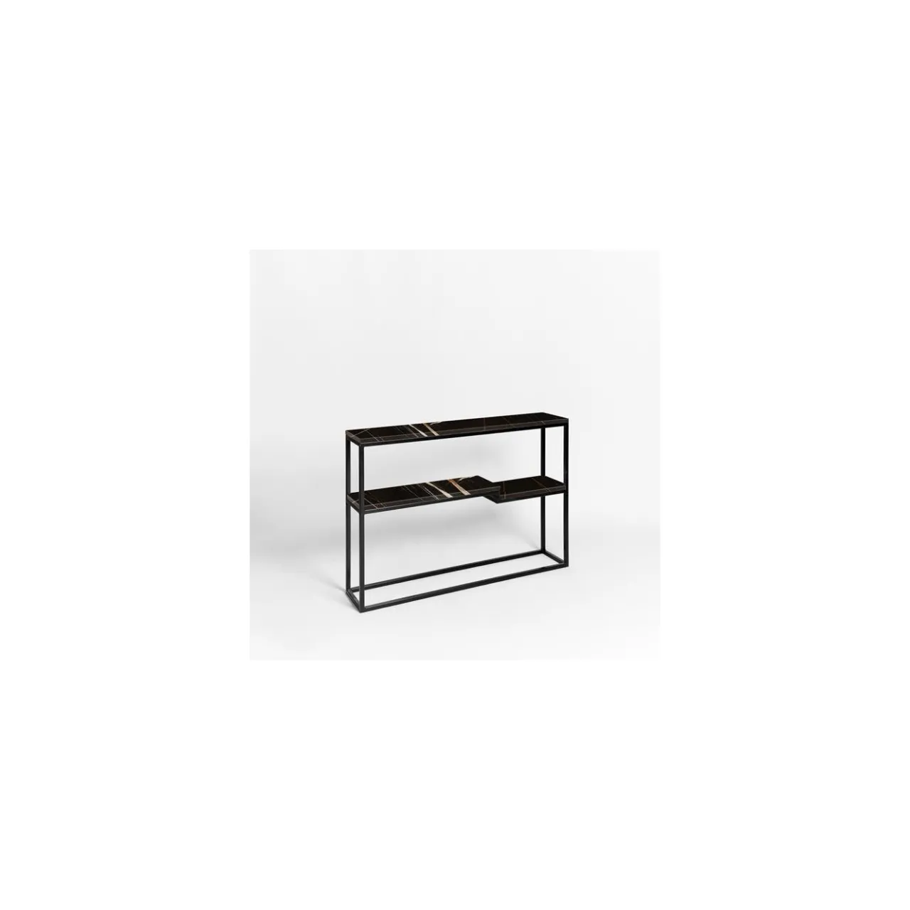 Il fascino visivo di questa raffinata consolle eleva l’estetica di un ingresso contemporaneo. Combinazione superlativa di colori e materiali, presenta due ripiani in marmo Sahara Noir con affascinanti venature dorate, racchiusi in una struttura pulita in ferro laccato nero, disponibile anche in oro o grigio. Questo design è disponibile su richiesta in un’ampia gamma di marmi.