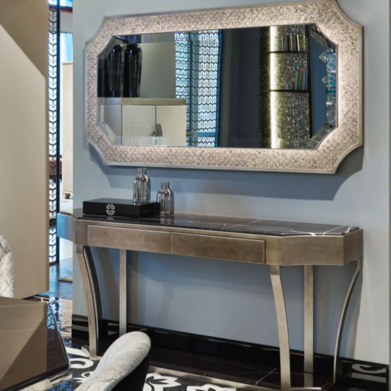 Questa consolle delicata e raffinata è uno squisito esempio di raffinatezza contemporanea. È caratterizzata da una struttura in metallo con un piano in marmo a forma di decoro.