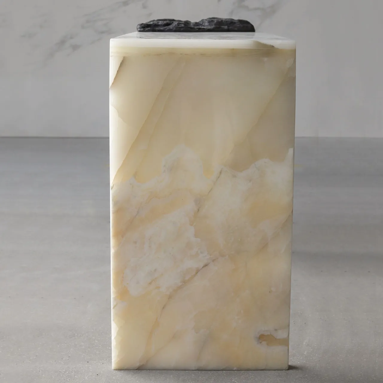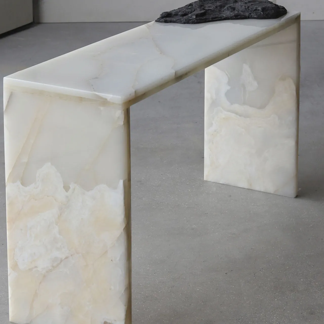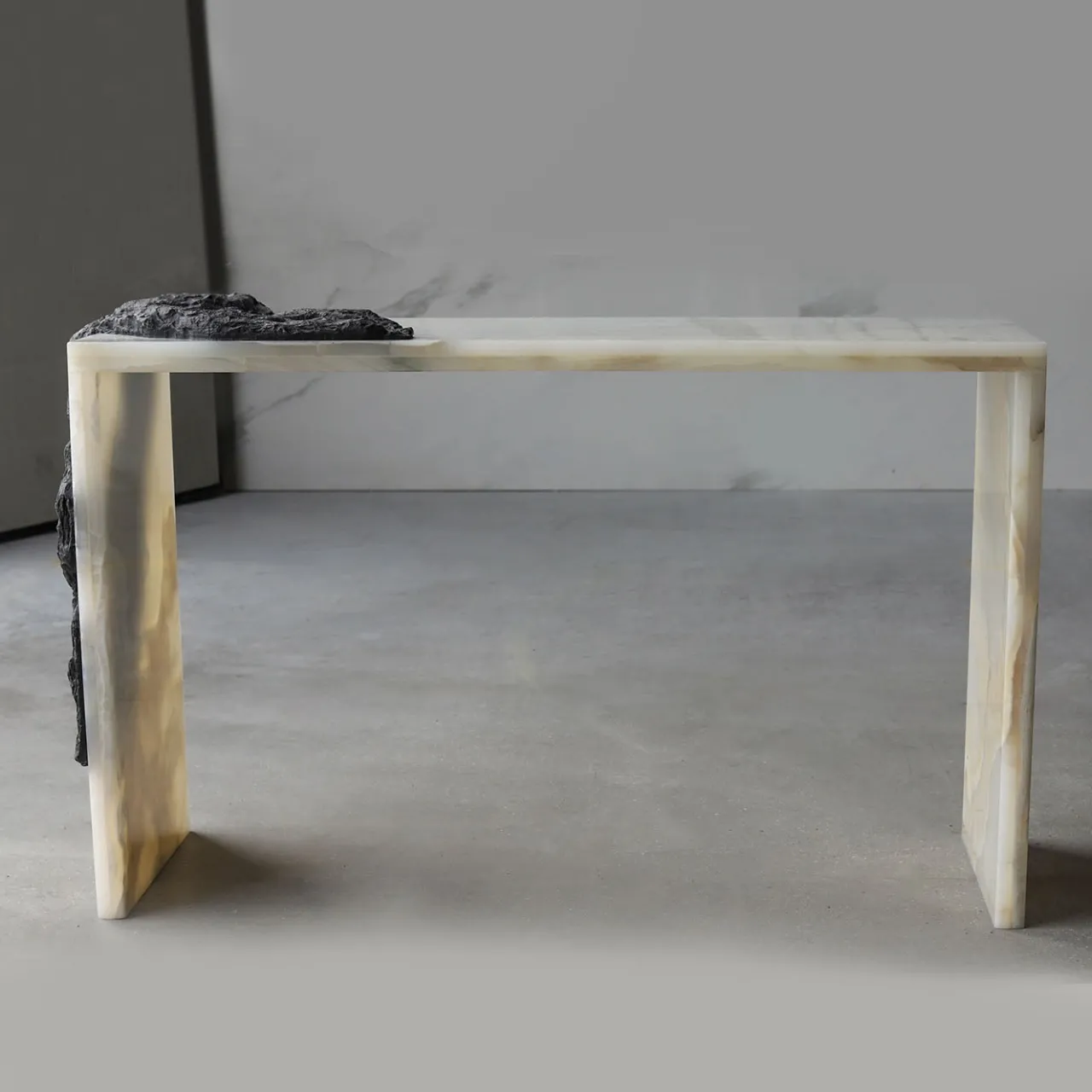 Questa raffinata console rettangolare si distingue per le sue linee semplici, classiche e geometriche. Realizzato con tre pannelli in Onice Bianco che compongono piano e gambe, il design è arricchito da un elegante dettaglio asimmetrico in marmo Marquina, che aggiunge un tocco di contrasto e sofisticatezza a questo pezzo moderno. La superficie levigata diffonde un bagliore morbido e lussuoso, riflettendo splendidamente la luce e valorizzando l’atmosfera dell’ambiente.