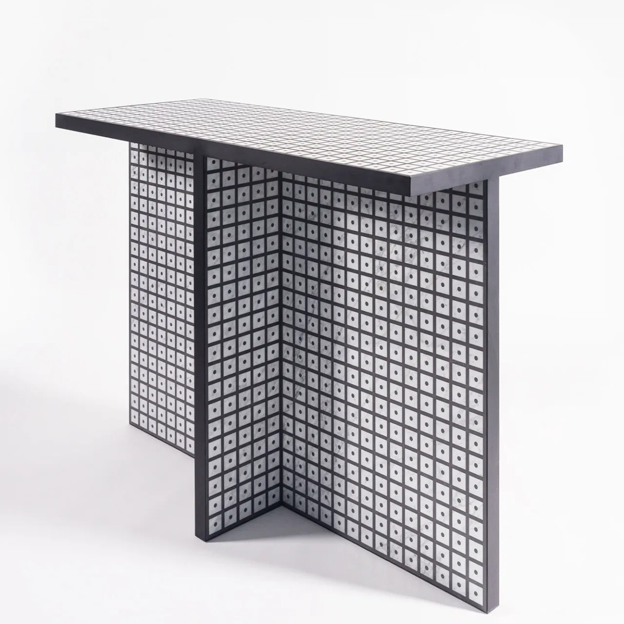 Disegnata da David e Nicolas Studio, questa accattivante consolle è un esercizio di rigore geometrico ottenuto combinando sapientemente sette pannelli in marmo e resina di cemento con una struttura metallica tagliata a T. Ogni lato è arricchito da una finitura lucida e colpisce con i suoi ipnotizzanti motivi geometrici. Sarà un’aggiunta azzeccata agli ingressi di stile contemporaneo.