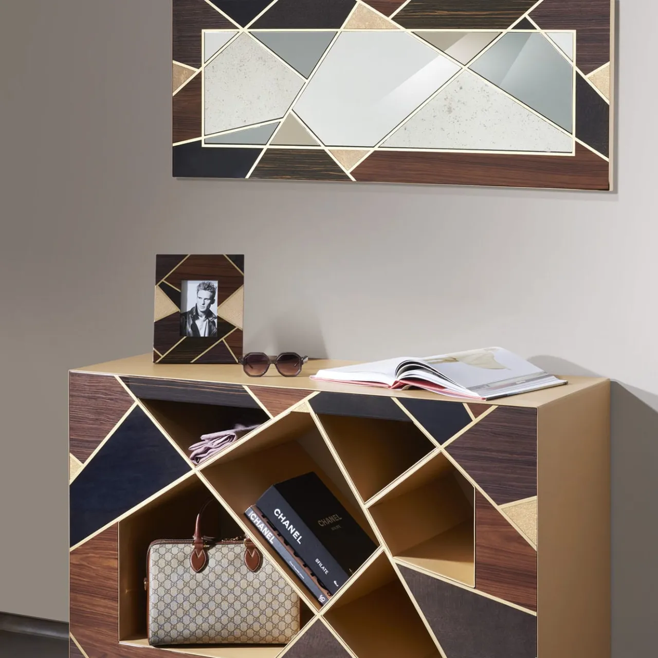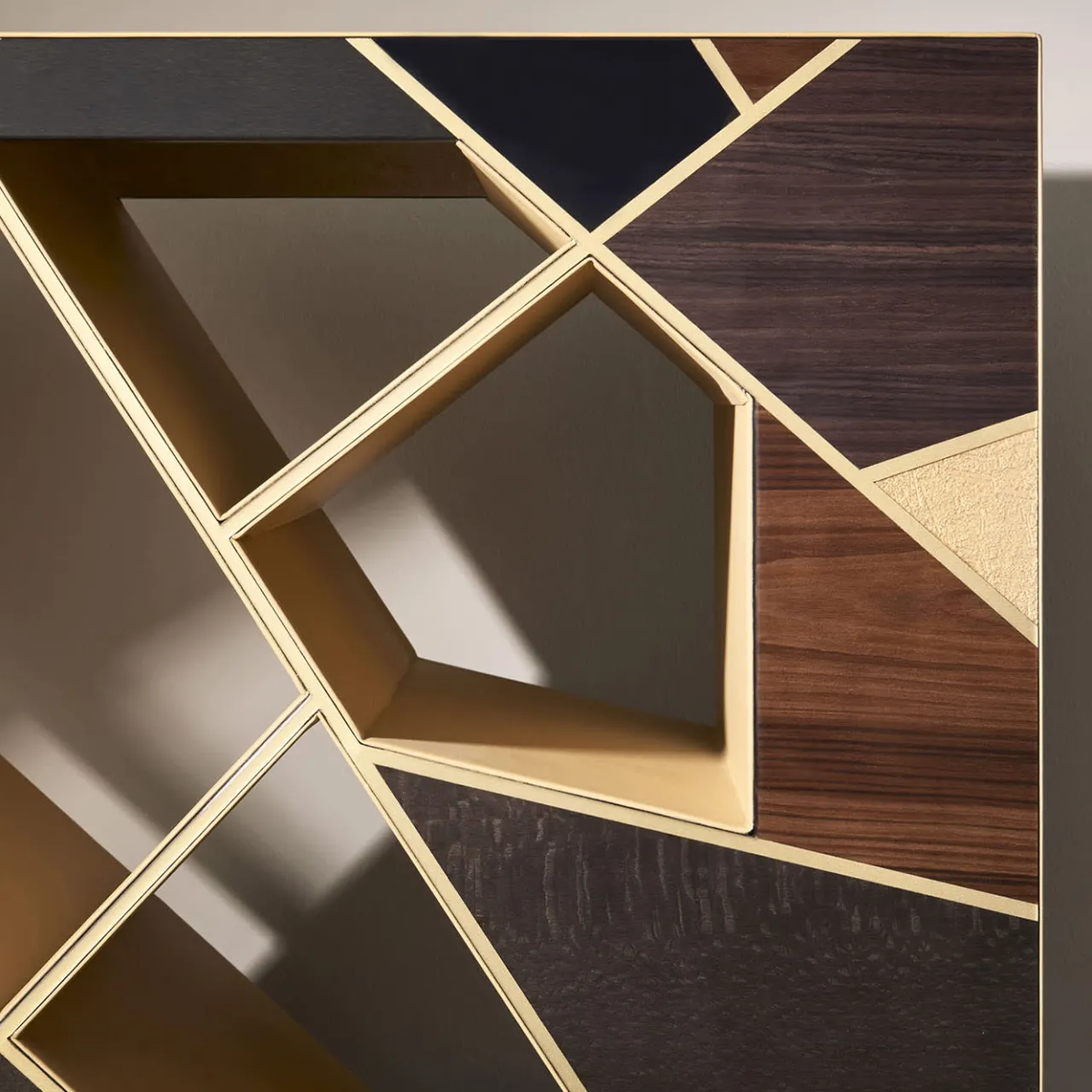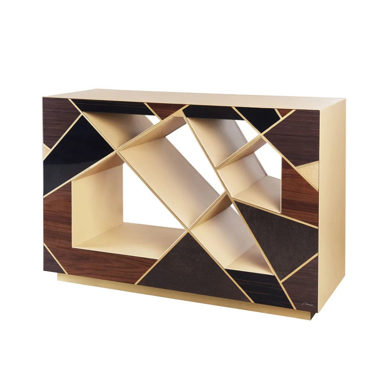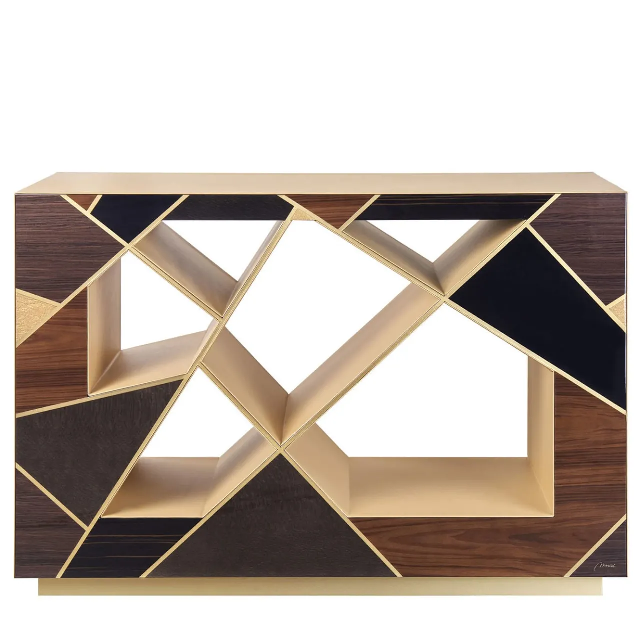 Ideale per essere collocata al centro della stanza e ammirata da entrambi i lati o per aderire alle pareti di un ingresso, questa consolle è un trionfo di intersezioni geometriche accentuate da una finitura dorata. Pregiati legni di Bolivar, palissandro, ebano e frassino compongono l’intarsio, mentre una pregiata pelle beige viene applicata a mano sui lati e sul piano. È disponibile anche una controparte a specchio per un look superbo e coeso.