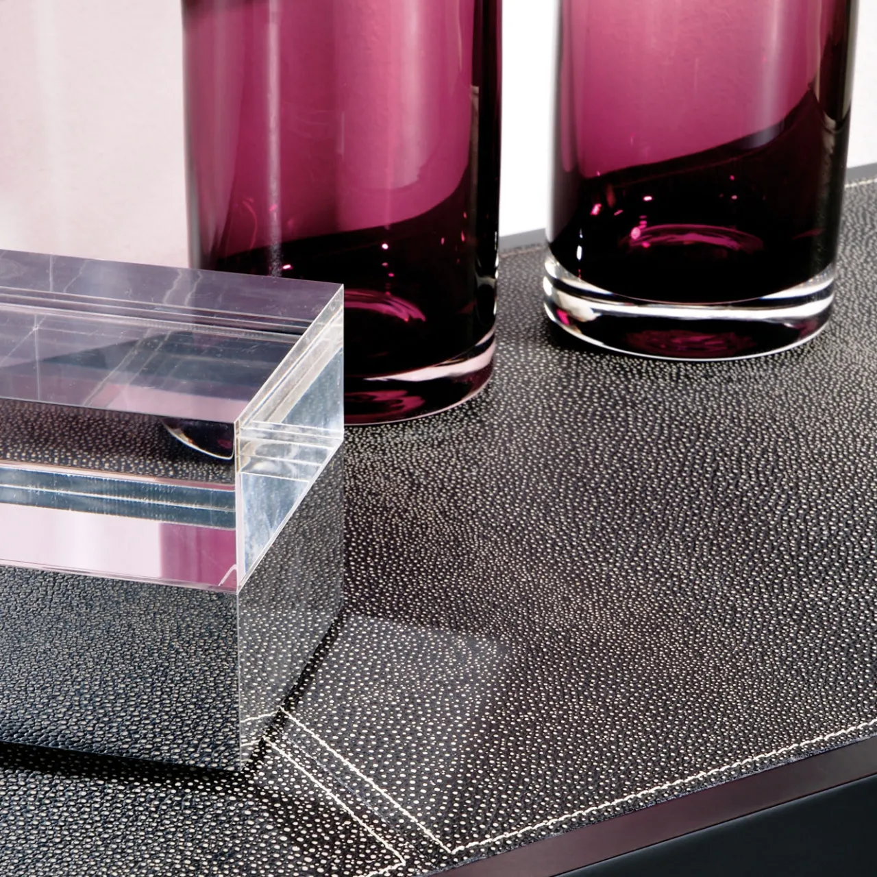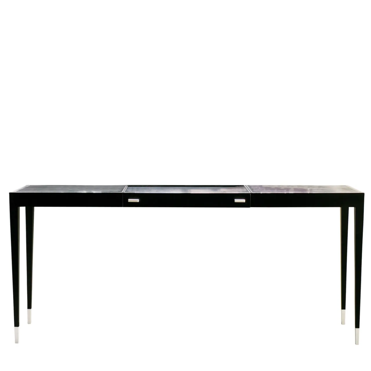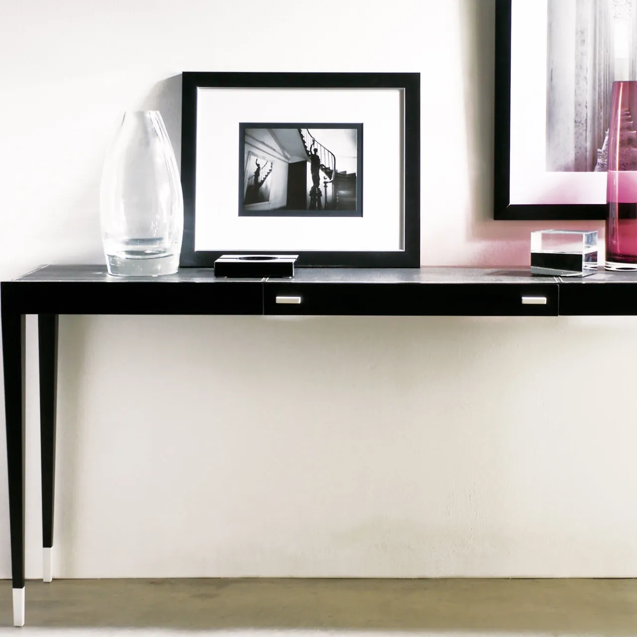 Splendida controparte della scrivania Victor, questa superba consolle può essere collocata all’ingresso per dare il benvenuto a ogni ospite in un ambiente elegante, oppure come ulteriore spazio espositivo o di lavoro accanto a un divano in salotto o nello studio. La struttura, sofisticata e senza tempo, è interamente realizzata in solido ebano Macassar. Il piano è impreziosito da uno zigrino nella stessa elegante tonalità degli accenti metallici color avorio che decorano la punta dei piedi e le maniglie dei cassetti.