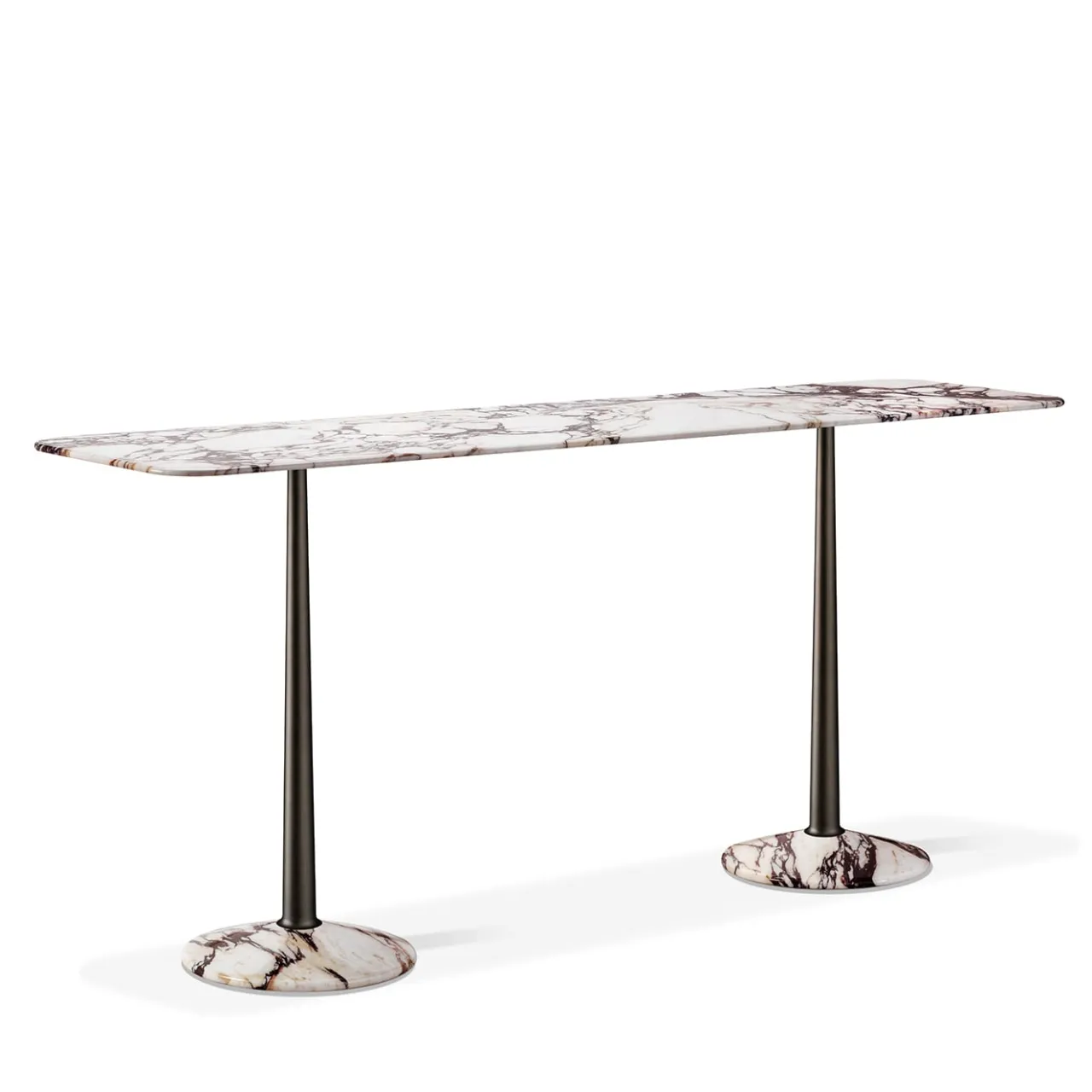 La consolle Arnold è caratterizzata da una raffinata combinazione di forme geometriche – una colonna affusolata, una superficie piana e una base tronco-conica – realizzata con proporzioni precise. Il design evidenzia un’elegante colonna in ottone che collega il sottile piano in marmo dai bordi arrotondati alla stabile base in marmo, offrendo solidità e un equilibrio compositivo distintivo. Questo pezzo offre un comfort sobrio grazie a materiali sofisticati e a un’attenta cura dei dettagli.