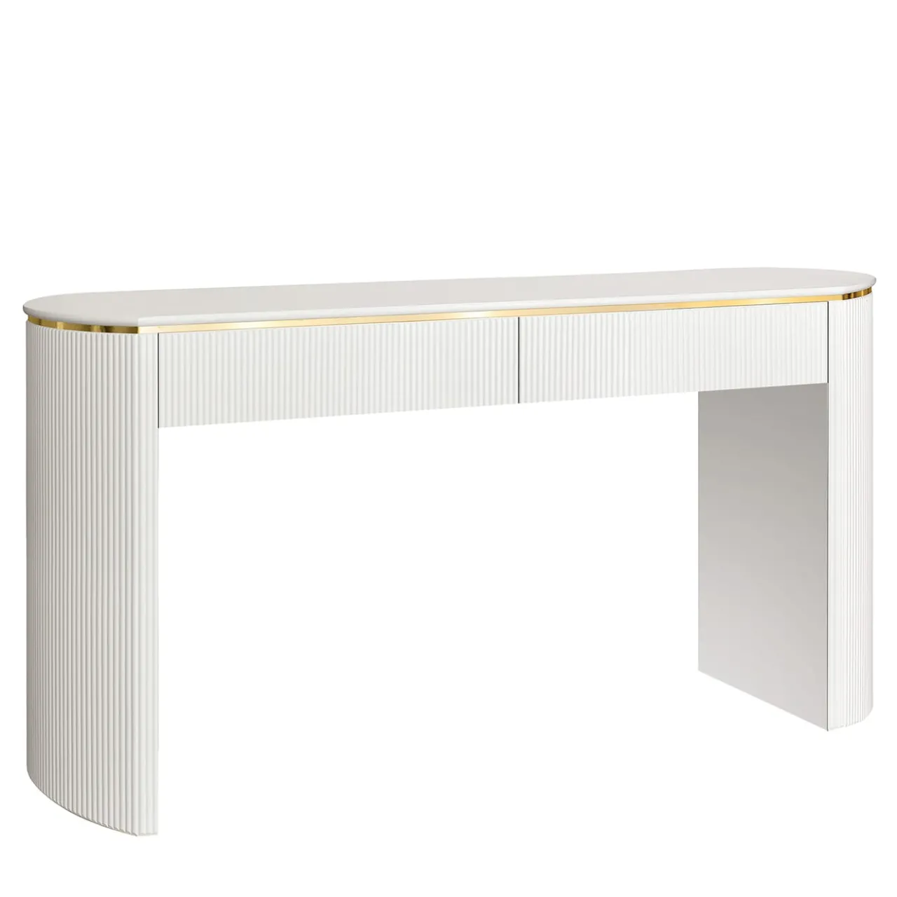 La maestria artigianale dà vita a questa consolle contemporanea, dove le linee pulite incontrano dettagli raffinati. La struttura in legno bianco, accentuata da profili in metallo dorato, crea un sofisticato gioco di texture e luce. Due cassetti push-pull perfettamente integrati consentono di riporre discretamente gli oggetti, esaltando il suo fascino minimalista. Perfetto per essere utilizzato come vanity in camera da letto o come elemento d’ingresso di grande impatto, questo pezzo incarna una sobria eleganza e una versatilità senza tempo.
