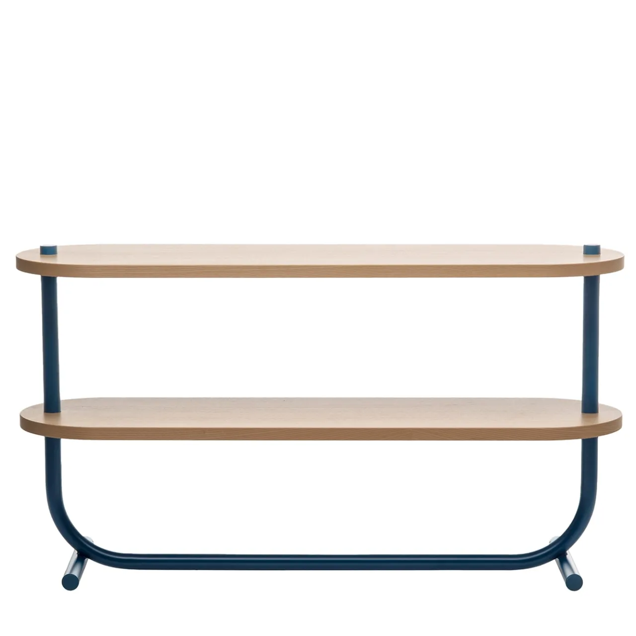 Parte della collezione Bubalus, questa lampada da tavolo è composta da piedini cilindrici e da un unico elemento cilindrico piegato che con essi compone la struttura in acciaio verniciato a polvere blu oceano. Trafitto ai lati dalla struttura generale, il piano sfoggia lati arrotondati e un’impiallacciatura di frassino naturale lucido. Perfetto per esporre oggetti da collezione.