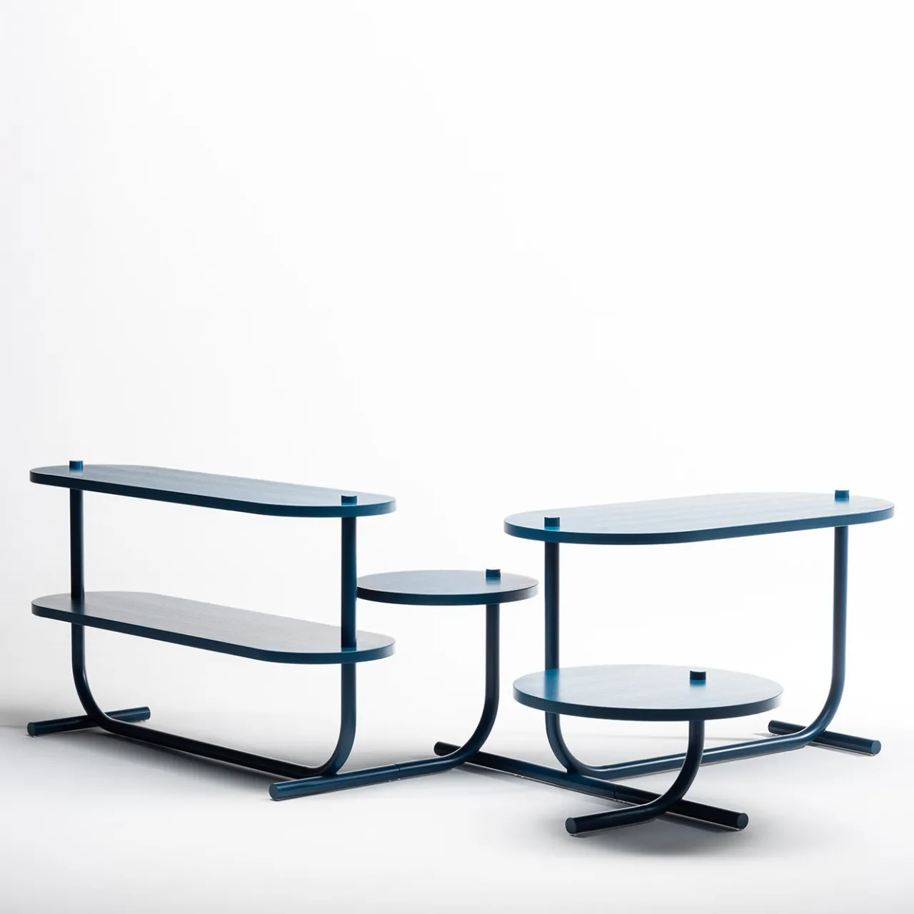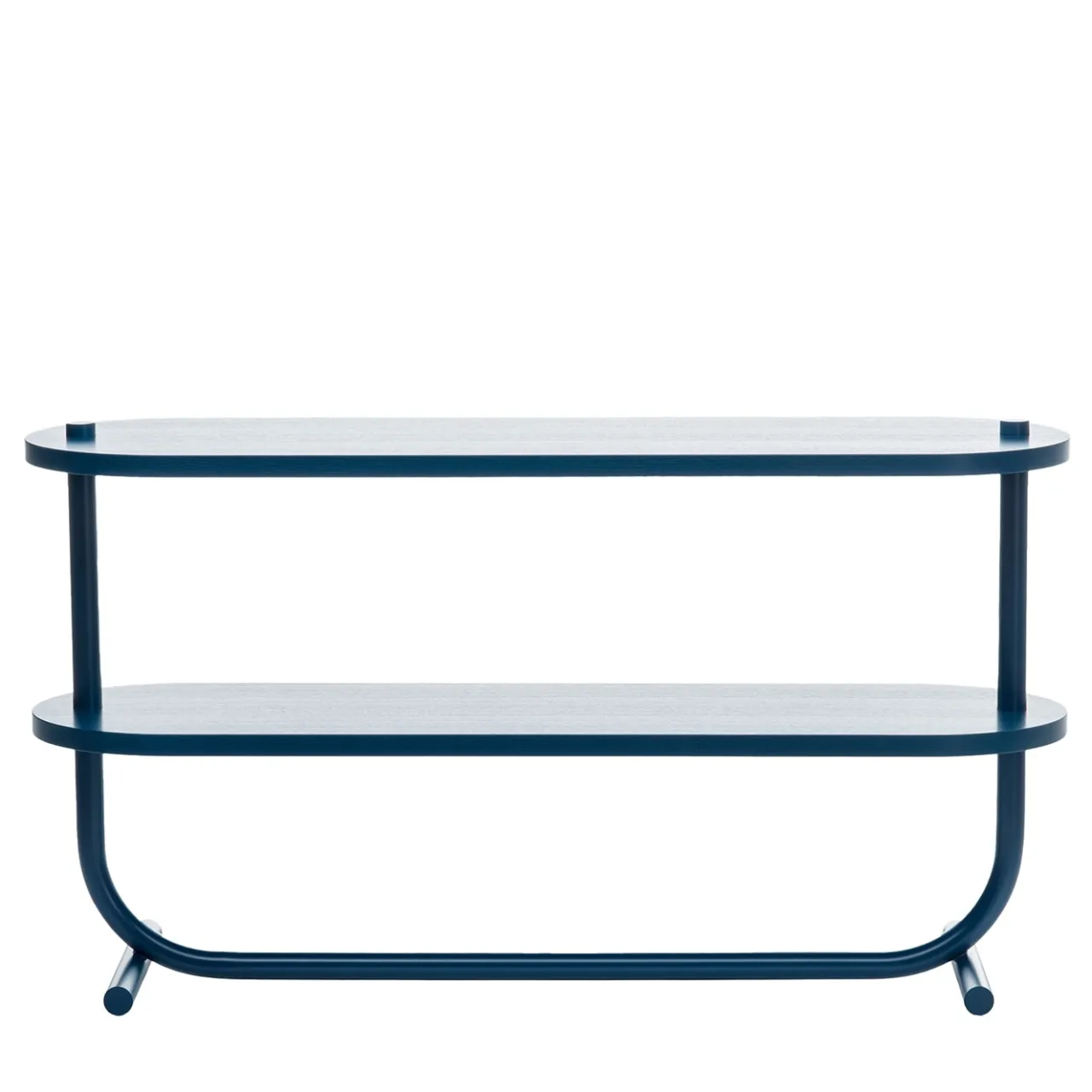 Questa consolle, che completa gli ingressi moderni, potrebbe evocare le acque dell’oceano, con le loro intense tonalità di blu e le onde instancabili. Coerentemente verniciato a polvere in blu oceano per rivelare immediatamente la sua ispirazione, il design offre due piani impiallacciati in frassino laccato opaco trafitti dalla struttura cilindrica in acciaio e sollevati su piedi cilindrici disposti orizzontalmente.