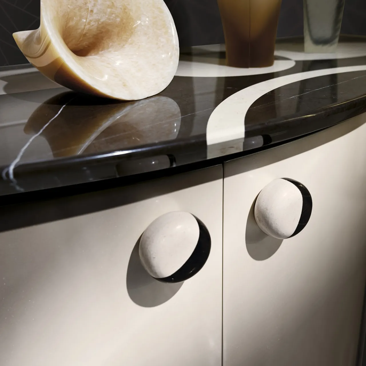Testimonianza di un’arte funzionale, questa consolle a forma di ellisse ridefinisce il concetto di contenitore per la camera da letto grazie alla sua impeccabile maestria. Sapientemente realizzata in legno laccato, il piano in marmo a doppia tonalità e le maniglie emanano un’opulenza moderna, elevando l’estetica di qualsiasi camera da letto. Questo pezzo fonde perfettamente la praticità con il design raffinato, offrendo un ampio spazio di archiviazione e facendo una dichiarazione sofisticata negli interni contemporanei.